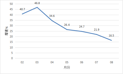 開平市1-8月經濟運行簡況 1-8月,全市主要經濟指標運行簡況如下: 一、工業生產 1-8月,開平規模以上工業企業累計完成工業增加值76.06億元,同比增長16.5%。 分經濟類型看,股份制企業增長27.4%;外商及港澳臺商投資企業增長9.6%;私營企業增長27.8%。分門類看,采礦業增加值增長1.6%,制造業增加值增長16.6%,電力、熱力、燃氣及水生產和供應業增加值增長18.1%。 1-8月全市工業用電量增長24.1%。 圖一:2021年2月以來我市工業增加值增速情況 二、投資 1-8月,全市完成固定資產投資同比增長12.3%。分經濟類型看,國有投資增長19.0%;民間投資增長30.2%。分產業看,第一產業投資增長161.3%;第二產業投資增長27.8%,其中工業投資增長27.8%;第三產業投資增長2.2%,其中房地產投資下降22.0%。 三、消費市場 1-8月,我市完成社會消費品零售總額114.74億元,同比增長12.4%。 圖二:2021年2月以來我市社會消費品零售總額增速情況 四、財政收入 1-8月,全市實現地方一般公共預算收入21.17億元,同比增長17.3%,其中稅收收入11.71億元,同比增長15.0%。 五、金融市場 1-8月,全市金融機構本外幣各項存款余額748.51億元,同比增長6.0%;本外幣各項貸款余額517.58億元,同比增長12.8%。全市金融機構人民幣各項存款余額730.34億元,同比增長6.4%;人民幣各項貸款余額515.99億元,同比增長12.6%。 2021.09.26