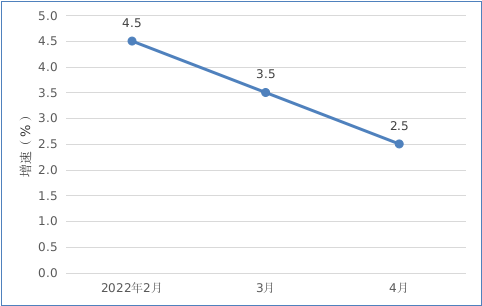 2022年2月以來我市規模以上工業增加值情況 二、投資 1-4月,全市完成固定資產投資同比下降2.9%。從分經濟類型看,國有投資增長49.3%;民間投資下降2.6%。分產業看,第一產業投資下降18.7%;第二產業投資增長8.9%,其中工業投資增長8.9%;第三產業投資下降9.8%,其中房地產投資下降28.4%。 三、消費市場 1-4月,我市完成社會消費品零售總額54.96億元,同比增長2.5%。 圖二