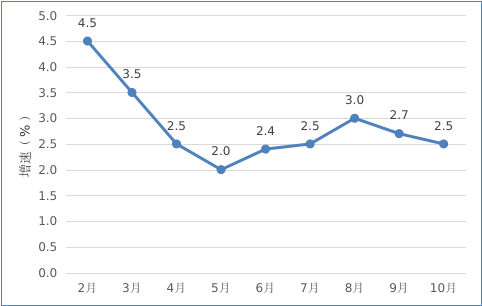 2022年2月以來我市規模以上工業增加值情況 二、投資 1-10月,全市完成固定資產投資同比下降13.2%。從分經濟類型看,國有投資增長39.2%;民間投資下降19.3%。分產業看,第一產業投資下降24.2%;第二產業投資增長3.3%,其中工業投資增長3.3%;第三產業投資下降23.3%,其中房地產投資下降35.6%。 三、消費市場 1-10月,我市完成社會消費品零售總額154.08億元,同比增長2.5%。 圖二