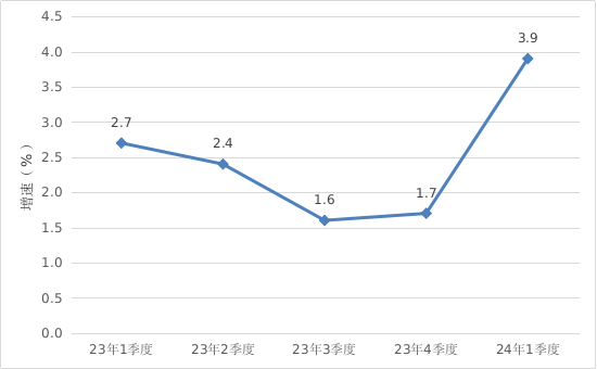 2024年一季度開平市經濟運行簡況 一季度,全市主要經濟指標運行簡況如下: 一、地區生產總值 根據江門市地區生產總值統一核算結果,2024年一季度,開平市實現地區生產總值109.12億元,同比增長2.6%。其中,第一產業增加值12.65億元,增長7.0%;第二產業增加值46.79億元,增長3.2%;第三產業增加值49.68億元,增長0.8%。 二、農林牧漁業 一季度,農林牧漁業總產值26.41億元,同比增長7.1%。分行業看,全市農業(種植業)產值增長3.8%,林業產值下降11.6%,牧業產值增長9.2%,漁業產值增長4.5%,農林牧漁專業及輔助性活動產值增長7.4%。 三、工業生產 一季度,開平規模以上工業企業累計完成工業增加值29.14億元,同比增長3.4%。 分經濟類型看,股份制企業增長12.2%;外商及港澳臺商投資企業下降4.1%;私營企業增長10.7%。分門類看,采礦業增加值下降37.4%,制造業增加值增長2.4%,電力、熱力、燃氣及水生產和供應業增加值增長96.4%。 一季度全市工業用電量增長10.6%。 圖一