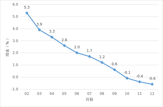 2024年,全市主要經(jīng)濟(jì)指標(biāo)運(yùn)行簡況如下: 一、地區(qū)生產(chǎn)總值 根據(jù)江門市地區(qū)生產(chǎn)總值統(tǒng)一核算結(jié)果,2024年,開平市實(shí)現(xiàn)地區(qū)生產(chǎn)總值515.47億元,同比增長2.5%。其中,第一產(chǎn)業(yè)增加值59.07億元,同比增長4.7%;第二產(chǎn)業(yè)增加值256.34億元,增長3.9%;第三產(chǎn)業(yè)增加值200.06億元,增長0.1%。全市三次產(chǎn)業(yè)結(jié)構(gòu)比為11.5∶49.7∶38.8。 二、農(nóng)林牧漁業(yè) 2024年,全市實(shí)現(xiàn)農(nóng)林牧漁業(yè)總產(chǎn)值114.79億元,同比增長5.4%。其中,農(nóng)業(yè)產(chǎn)值40.96億元,同比增長4.1%;林業(yè)產(chǎn)值3.26億元,增長10.0%;牧業(yè)產(chǎn)值47.74億元,增長6.3%;漁業(yè)產(chǎn)值13.63億元,增長3.0%;農(nóng)林牧漁專業(yè)及輔助性活動產(chǎn)值9.21億元,增長10.2%。 三、工業(yè)生產(chǎn) 2024年,開平規(guī)模以上工業(yè)企業(yè)累計完成工業(yè)增加值132.04億元,同比增長2.0%。 分經(jīng)濟(jì)類型看,股份制企業(yè)增長7.4%;外商及港澳臺商投資企業(yè)下降2.6%;私營企業(yè)增長1.9%。分門類看,采礦業(yè)增加值下降38.4%,制造業(yè)增加值增長1.1%,電力、熱力、燃?xì)饧八a(chǎn)和供應(yīng)業(yè)增加值增長68.5%。 2024年全市工業(yè)用電量增長6.5%。 圖一 2024年2月以來開平市規(guī)模以上工業(yè)增加值增速 四、投資 2024年,全市固定資產(chǎn)完成投資同比增長0.3%。分三次產(chǎn)業(yè)來看,第一產(chǎn)業(yè)完成投資同比下降50.2%;第二產(chǎn)業(yè)完成投資同比增長0.5%;第三產(chǎn)業(yè)完成投資同比增長2.6%。分三大建設(shè)領(lǐng)域來看,工業(yè)完成投資同比增長0.5%;基礎(chǔ)設(shè)施完成投資同比增長8.3%;房地產(chǎn)完成投資同比下降11.9%。 五、消費(fèi)市場 2024年,我市完成社會消費(fèi)品零售總額188.45億元,同比下降0.6%。 圖二 2024年2月以來開平市社會消費(fèi)品零售總額增速 六、財政收入 2024年,全市實(shí)現(xiàn)地方一般公共預(yù)算收入32.04億元,同比增長3.2%,其中稅收收入15.70億元,同比下降7.1%。 七、金融市場 12月末,全市金融機(jī)構(gòu)本外幣各項(xiàng)存款余額1033.96億元,同比增長10.6%;本外幣各項(xiàng)貸款余額724.69億元,同比增長7.2%。
