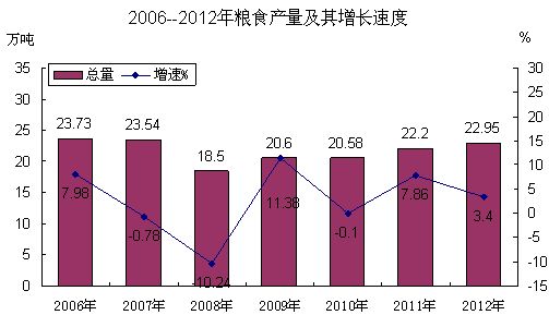 全年糧食總產量22.95萬噸,比上年增長3.4%,其中:稻谷21.20萬噸,增長2.9%。