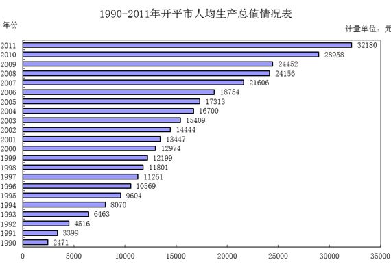 地區生產總值是按市場價格計算的一個地區所有常住單位在一定時期內生產活動的最終成果,也即是各產業增加值之和。它全面反映經濟整體情況,是整個宏觀經濟分析中的核心指標。本文將圍繞開平市生產總值在改革開放以來的發展情況,從不同的方面進行分析研究。        (二)人均地區生產總值穩步增長        二、經濟發展經歷了四個經濟周期        第一個周期(1979—1983年):用時5年,地區生產總值年均增長10.14%。1981年達到峰值18.23%,然后開始下滑至1983年的谷位完成我市改革開放以來的第一個經濟周期。這一周期的持續時間與廣東省及江門市的時間大致一致。波動幅度為16.69個百分點,比江門市波幅大9.89個百分點、比廣東省波幅大1.09個百分點。        通過與省、地市經濟周期的對比發現,我市各經濟周期的波動跟隨著省、江門市的經濟周期波動趨勢發展,而且表現更為強烈。我市經濟周期發展的不對稱,表明我市經濟的發展由前期基礎不穩,抗風險能力弱,對市場變動反應強烈。到后期進入二十一世紀后,隨著全省整體經濟發展的帶動及內生增長動力不斷增強,經濟發展的穩定性逐步提高,跟省、地市經濟的波動差距大幅收窄。        (二)三次產業對經濟增長的彈性系數        用各產業的彈性系數均值進行排位,分別是:第一產業是0.2689、第二產業1.1005、第三產業1.0984。以此得出:第二產業對地區生產總值的彈性最高,也就是地區生產總值的增長對第二產業的增長依存度最高,是拉動我市經濟增長的主導產業;其次是三產和一產。        (一)描繪相關圖。           (1)投資與地區生產總值的相關圖              (2)出口與地區生產總值的相關圖         根據三個相關圖的分布狀態,作出以下判斷:1、三個圖表可以直觀地顯示出投資、出口和消費與地區生產總值之間存在著相關關系。2、相關的形態。三個相關圖形上近似表現為一條直線的線性相關關系。3、相關的方向。因變量地區生產總值的數值變化與自變量投資、出口和消費的數值隨之發生大致均等變化的正相關關系。相關分析的條件成立,進行下一步的分析。        (二)按發展結構對比。選取省內縣級經濟的三次產業結構進行地區間對比。根據產業結構變遷理論,對第一產業按由小到大、對第二、三產業則按由大到小進行排序。我市在省內的排位情況是:一產前列、二產中上游及三產中下游的水平。主要情況是:在“十一五”期間,第一產業的排位較穩定均在前十名,排在第7位;第二產業的排位上升6位排在第10位;第三產業則下跌24位,排在第41位。具體見表六:        六、發展建議