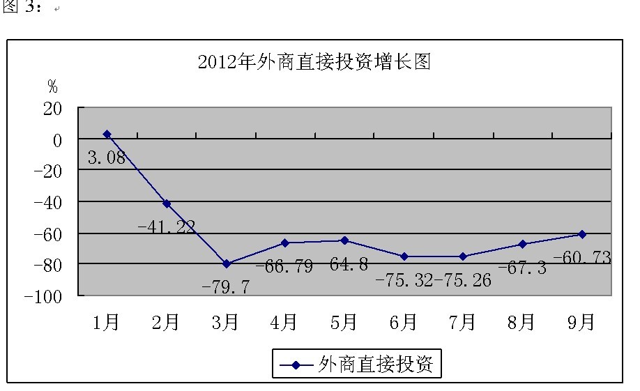 受當前經濟形勢的影響,我市經濟在經歷前段時間的波動后,在第三季度的各項指標有升有降,有向上發展呈回穩態勢的,也有發展末如理想的。具體情況如下: 外商直接投資方面。1—9月份,我市實際利用外商直接投資4703萬美元,只完成年度任務39.82%,同比下降60.73%,已連續8個月在負增長里徘徊。見圖3: (三)園區經濟進入發展期