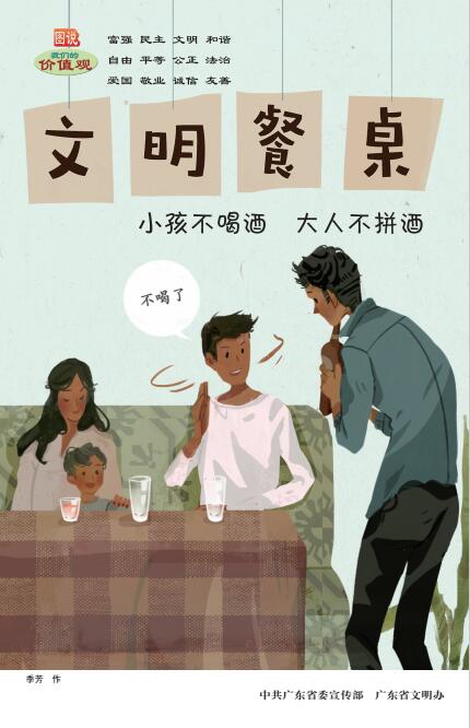 為在全社會倡導文明用餐、節儉用餐的良好風尚,推動核心價值觀建設落細落小落實,廣東省委宣傳部、省文明辦組織創作了文明餐桌主題宣傳畫,現作為第七批社會主義核心價值觀公益廣告予以發布,供各地各部門宣傳使用。(來源:南方網)