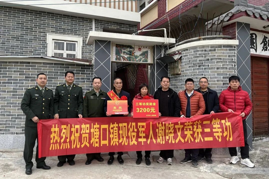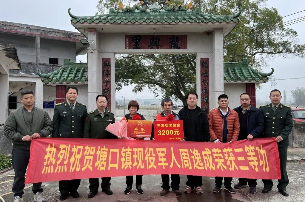 為弘揚擁軍優屬、擁政愛民的光榮傳統,激發部隊士兵安心服役、建功軍營、獻身國防的政治熱情,近日,開平市退役軍人事務局、市人民武裝部和塘口鎮一行組成慰問團,分別到潭溪鳳社村和升平龍興村,為榮立三等功的現役軍人謝曉文和周逸成的家屬送去喜報。