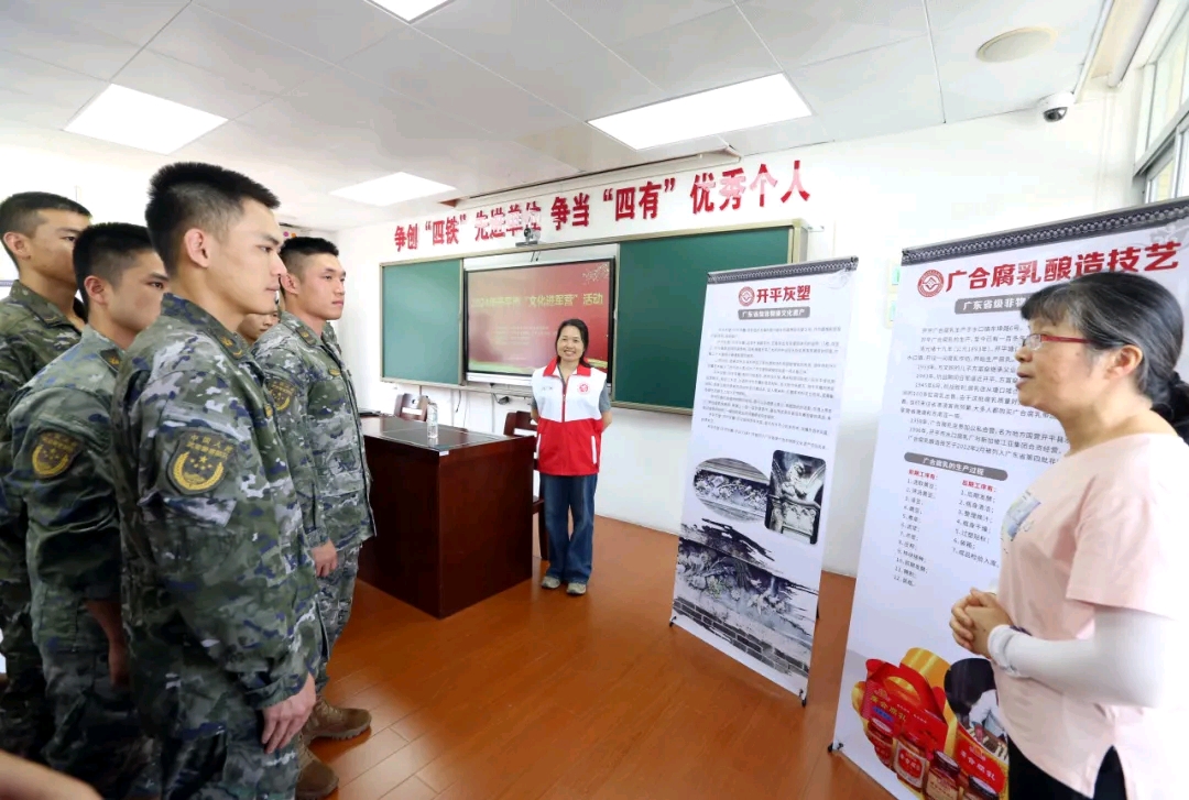 在部隊駐地,官兵們首先觀看了開平非遺圖文展覽,了解開平市的泮村燈會、開平民歌、開平灰塑、金聲獅鼓制作技藝、廣合腐乳釀造技藝等非物質文化遺產項目的歷史和內涵。