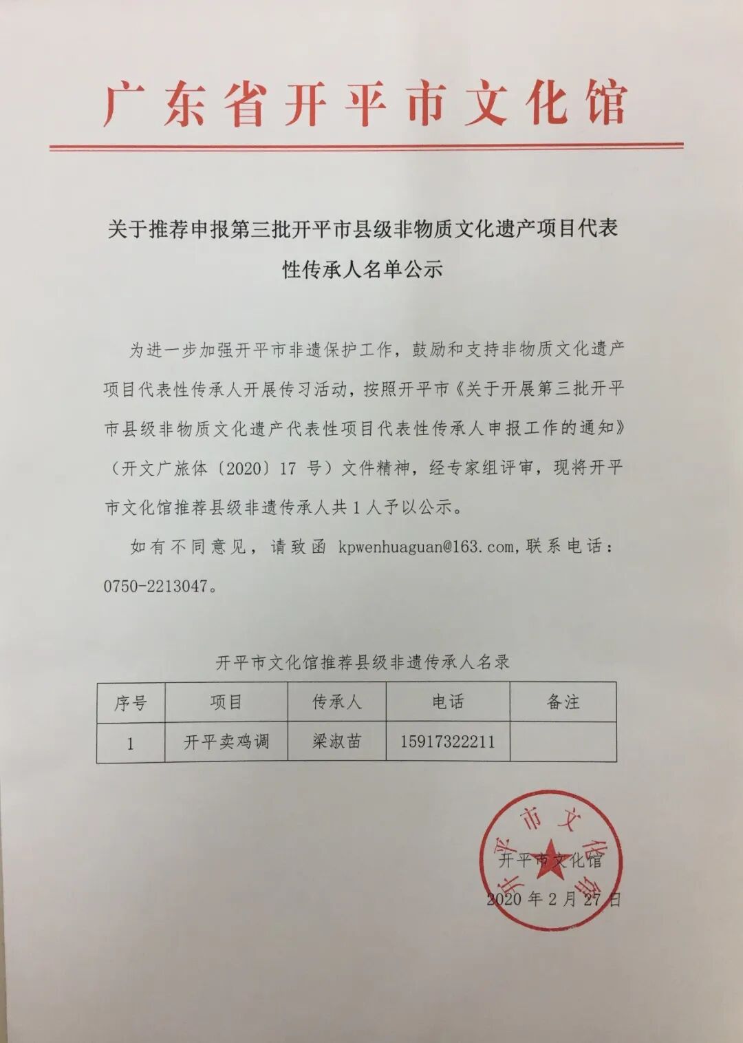 關(guān)于推薦申報(bào)第三批開(kāi)平市縣級(jí)非物質(zhì)文化遺產(chǎn)項(xiàng)目代表性傳承人名單公示