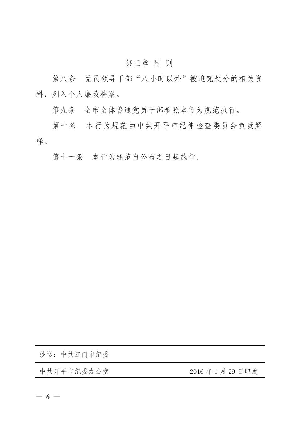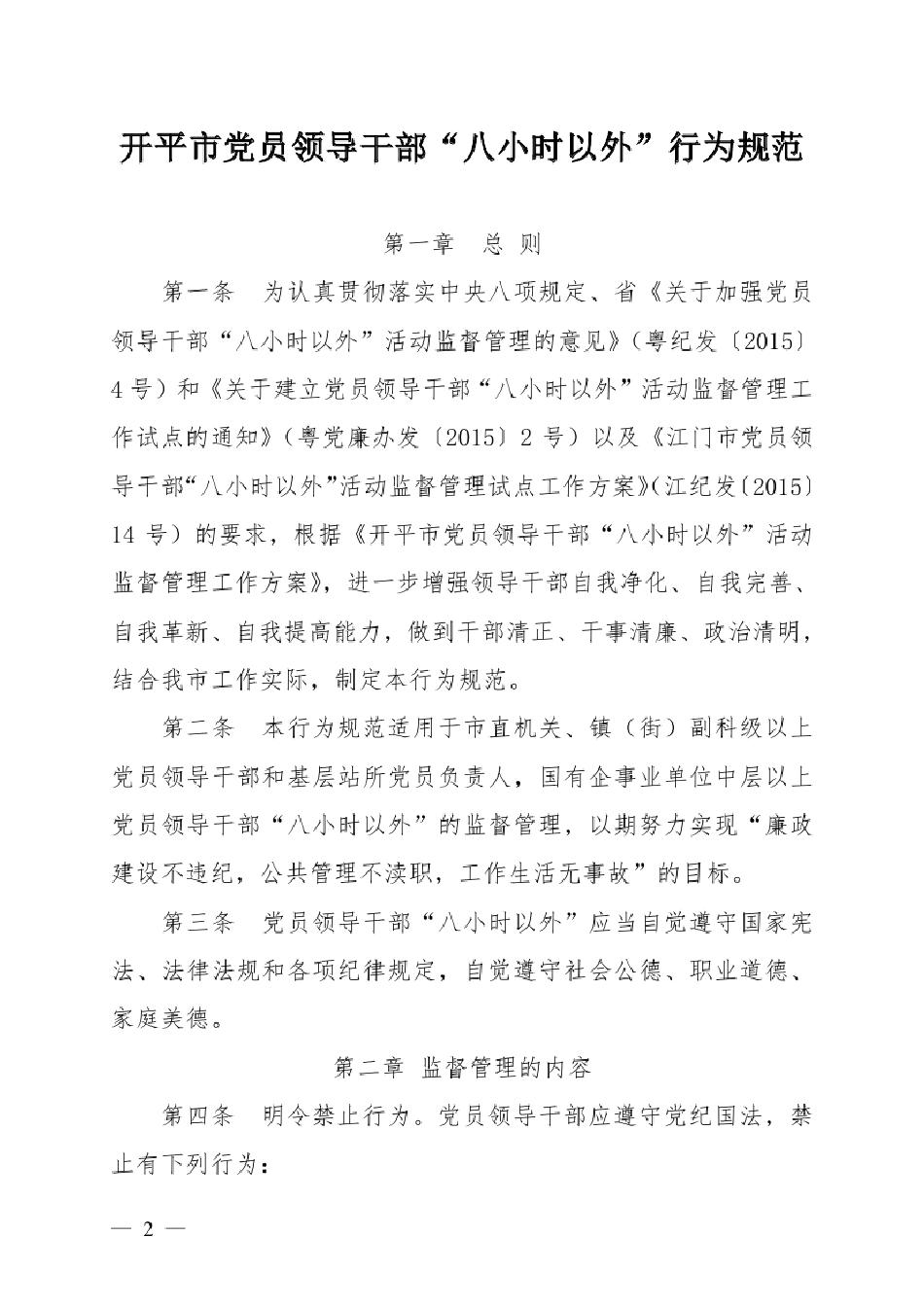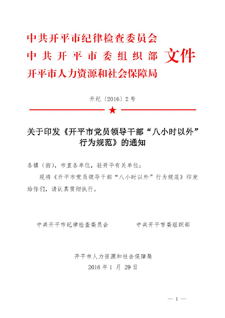 【工作制度】開(kāi)紀(jì)〔2016〕2號(hào) 關(guān)于印發(fā)《開(kāi)平市黨員領(lǐng)導(dǎo)干部“八小時(shí)以外”行為規(guī)范》的通知