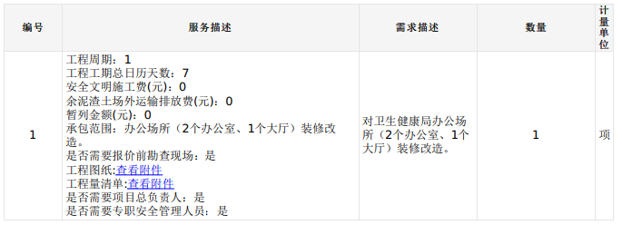 定點議價采購公告 開平市衛生健康局采用定點采購議價方式實施本次采購。 一、項目信息 (一)項目名稱:開平市衛生健康局裝修工程定點采購 (二)項目編號:DDYJ-2024-1060289 (三)預算金額:28,000.00 (四)采購需求: (五)議價發起時間:2024年01月19日 二、需求信息 合同份數:3 爭議處理方式:向仲裁委員會申請仲裁解決 發票類型:增值稅普通發票 三、供應商報價須知 (一)被邀請的供應商應根據議價信息的要求,在滿足采購需求的前提下,于規定時間內對項目做出報價。 (二)供應商應在報價時,可通過系統提供采購需求中所要求的全部資料與數據的,應當通過系統提交。供應商不得在所上傳的