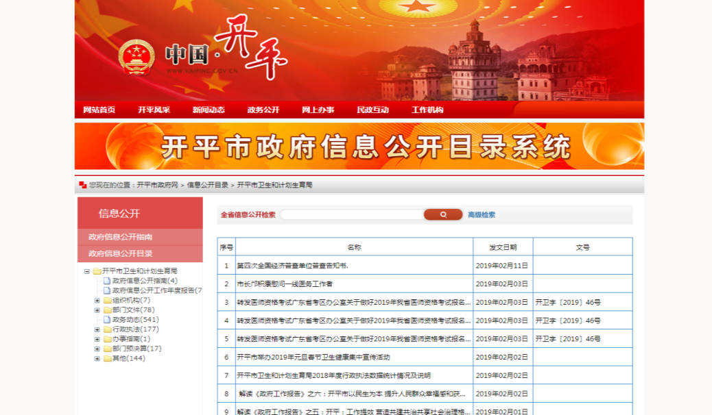 開平市衛生和計劃生育局 2018年政府信息公開工作年度報告 根據《中華人民共和國政府信息公開條例》(以下簡稱《條例》)和開平市人民政府要求,現編制開平市衛生和計劃生育局2018年政府信息公開工作報告。本報告中所列數據的統計期限自2018年1月1日至2018年12月31日止。本報告的電子版可在中共開平市委市政府公眾網(www.auxus.cn)和開平市衛生和計劃生育局政務信息網(www.auxus.cn/kpwjj/)下載。如對本報告有任何疑問,請與開平市衛生和計劃生育局辦公室聯系(地址:開平市人和東路12號5幢,郵編:529300,電話:2212725)。 一、概述 以貫徹習近平新時代中國特色社會主義思想、黨的十九大精神為指引,2018年開平市衛生和計劃生育局積極做好深化醫藥衛生體制改革提升醫療技術服務,完善基本公共衛生體系,鞏固人口計生服務水平和居民健康保障水平,嚴格按照黨的十八屆六中全會精神和《中華人民共和國政府信息公開條例》規定依法公開衛生計生工作信息,組織全局領導干部深入學習《政府信息公開條例》、《中華人民共和國保守國家秘密法》、《保密法實施條例》,增強領導干部法制觀念和保密防范意識,提高信息公開水平,通過各大媒體重點公開2018年開平市衛生計生工作有關信息,狠抓工作落實,充分保障人民群眾的知情權、參與權、監督權。 二、主動公開政府信息工作情況 2018年,我局嚴格按照《中華人民共和國政府信息公開條例》的規定,通過政務網站、微信微博、報刊、公開宣傳欄、電子信息屏等多種形式公開信息,及時更新發布單位領導、主要職責、機構設置、辦事指南、政策法規、通知公告、政務動態等欄目內容,做好政策宣傳和解讀工作。 圖1:開平市衛生和計劃生育局政務信息網、政府信息公開目錄系統 (一)依托開平市衛生和計劃生育局政務信息網及開平市政府信息公開目錄系統主動公開政府信息537條。其中,政府規章文件類信息118條,占22.0%;政務工作動態類信息193條,占36.0%;行政執法類信息77條,占14.3%;辦事指南類信息55條,占10.2%;工作報告及財政預決算信息7條,占1.3%;其他信息87條,占16.2%。 圖2:2018年開平市衛生和計劃生育局主動公開政府信息數據表 (二)做好“雙隨機、一公開”工作。及時公開開平市醫療衛生機構組織目錄表。依法公開2018年開平市衛生和計劃生育局部門預算、2017年開平市衛生和計劃生育局匯總決算公開報告等信息。2018年及時公開衛生計生行政審批、行政執法信息共77條,公開2018年度行政執法數據統計情況及說明:行政許可申請總數為982宗,予以許可980宗;行政處罰總數為248宗,罰沒金額54.06萬元;行政強制總數為3宗;行政檢查總數為844次。 圖3:2018年開平市衛生和計劃生育局行政執法數據表 (三)做好基本醫療衛生領域政府信息公開。及時印發并公布《開平市衛生計生系統推進社會公益事業建設領域政府信息公開工作方案》《開平市衛生計生局推進重大建設項目實施領域政府信息公開工作方案》,依托政務網站微博微信等重點公開重大疾病預防控制、國家免疫規劃、突發公共衛生事件、傳染病疫情及防控、健康科普等信息。 1、2018年每月發布通報月度法定傳染病疫情信息、全市較大級別突發公共衛生事件信息共計12次,2018年全市無甲類傳染病發生,乙類和丙類傳染病發病率控制在國家規定范圍內,總體處于平穩,未發生重大突發公共衛生事件。 2、2018年,醫聯體分院上轉患者約1614人次,總院下轉患者約 1256人次。全市公立醫院醫療費用同比增長約為2.80%,控制在省、市要求不超過9%的范圍內。 3、2018年計生特殊家庭各項扶助關懷政策全面落實,全市惠及各類計劃生育扶助保障對象1.86萬余人,發放各項計劃生育保障資金約2525.72萬。 4、2018年成功創建省級健康促進示范單位共40家(其中:社區7家、醫院5家、學校10家、機關12家、企業6家),創建健康促進家庭210家。 5、2018年依托江門市公共資源交易中心開平分中心政務網站及時準確公開建設工程招投標信息36條(其中:招標公告17條、補充修改公告3條、評選結果公告8條、中標公告8條)和政府采購信息70條(其中:采購信息40條、采購結果公告30條)。 (四)通過政務微博微信新媒體、工作簡報向全市衛生計生系統及全社會反映我市各項衛生計生工作開展情況。2018年,通過“開平衛生計生”政務微博發布信息1225條,通過“開平衛生計生”政務微信訂閱號發布信息516條,編發《開平衛生計生工作簡報》共12期、《開平市基本公共衛生服務項目工作簡報》共6期。 (五)通過宣傳欄、電子信息屏等及時發布衛生計生政策、服務收費等工作信息。保障群眾對全市衛生計生工作的知情權、參與權、監督權,努力為社會公眾提供更加簡便、快捷、透明的服務。 1、在局機關多處宣傳欄發布行政審批流程、干部考察預告、公開干部選拔任用、獎懲情況,接受群眾的監督,張貼各類通知和便民信息,方便前來辦事的群眾。 2、強化鎮村衛生計生“三欄”建設和政策宣傳解讀。廣泛宣傳計生新政、婚育新風、疾病預防、保健常識和基本公共衛生服務等信息。 3、加強院務公開工作。在各醫療機構設置院務公開欄,定期公開醫療服務、服務價格及收費信息等重點院務信息,進一步推動和規范醫院院務公開工作,促進醫院民主科學管理,依法執業,誠信行醫,構建和諧醫患關系。 (六)推進“陽光服務”建設。深