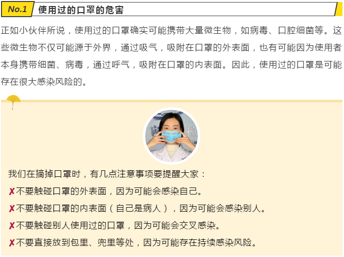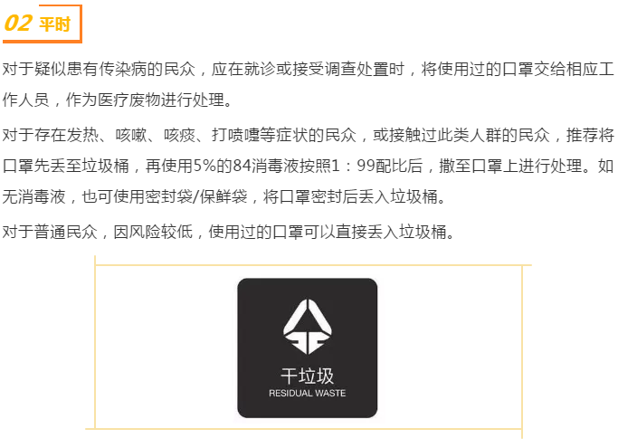 關(guān)于新型冠狀病毒感染的肺炎,想知道的看過(guò)來(lái)(七)最近兩天,不斷有小伙伴問(wèn)“用過(guò)的口罩,沾滿了細(xì)菌、病毒,建議不要隨意丟棄”,甚至擔(dān)心被別有用心的回收利用,并給出了解決辦法“拿開水燙一下、定點(diǎn)焚燒、剪碎了再扔”。(來(lái)源:微信公眾號(hào)“上海疾控”。編輯:袁子藝)