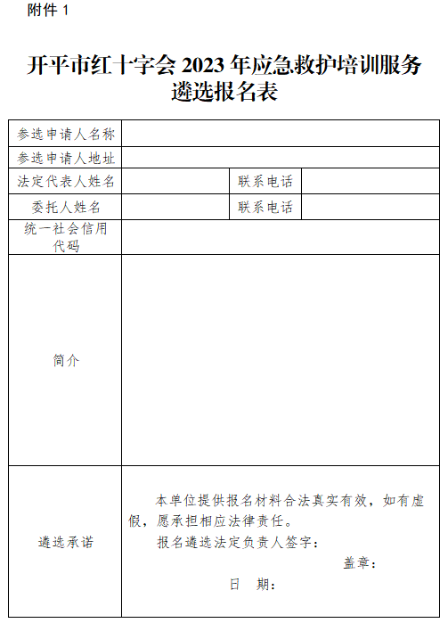 為促進(jìn)我市應(yīng)急救護(hù)培訓(xùn)普及化、專業(yè)化和社會化,我會擬采購應(yīng)急救護(hù)培訓(xùn)服務(wù),現(xiàn)面向社會征集遴選應(yīng)急救護(hù)培訓(xùn)服務(wù)提供機(jī)構(gòu)。 一、 項(xiàng)目基本情況及要求 (一)項(xiàng)目名稱內(nèi)容:應(yīng)急救護(hù)培訓(xùn)服務(wù)。 (二)預(yù)算金額:35000元(大寫:人民幣叁萬伍仟元整)。 (三)服務(wù)內(nèi)容: 1.應(yīng)急救護(hù)知識普及; 2.初級救護(hù)員(持證)培訓(xùn); 3.CPR+AED救護(hù)員(持證)培訓(xùn)。 (四)服務(wù)期限:自合同簽訂之日起至2023年12月31日。 二、服務(wù)機(jī)構(gòu)資格要求 參選申請人必須符合《中華人民共和國政府采購法》第二十二條規(guī)定并具備以下條件: (一)參選申請人必須是經(jīng)工商行政管理部門注冊登記、具有獨(dú)立法人資格或具有獨(dú)立承擔(dān)民事責(zé)任能力的其它組織; (二)具有完成培訓(xùn)服務(wù)所必備的條件和能力,具備持有中國紅十字救護(hù)師資證書的團(tuán)隊(duì); (三)近三年內(nèi)無違法經(jīng)營行為,不得違背社會道德風(fēng)尚,具有良好的社會信譽(yù); (四)參選申請人注冊地及經(jīng)營場所必須在開平市市區(qū)(提供房產(chǎn)證明或經(jīng)營場所租賃合同復(fù)印件); (五)本服務(wù)不接受聯(lián)合體申報(bào)。 三、報(bào)名要求 (一)報(bào)名時(shí)間:2023年5月5日-2023年5月11日。 (二)報(bào)名地點(diǎn):開平市紅十字會辦公室(地址:開平市長沙東興大道人和東路12號5幢,聯(lián)系人:鄒小姐,電話:2213653)。 四、資料提交 (一)開平市紅十字會2023年應(yīng)急救護(hù)培訓(xùn)服務(wù)遴選報(bào)名表(附件1); (二)經(jīng)辦人員身份證復(fù)印件、授權(quán)委托書; (三)有效營業(yè)執(zhí)照副本或社會團(tuán)體法人登記證書復(fù)印件加蓋公章(業(yè)務(wù)范圍包括急救知識宣講或應(yīng)急救護(hù)等服務(wù)內(nèi)容); (四)經(jīng)營場所證明材料(提供房產(chǎn)證明或經(jīng)營場所租賃合同復(fù)印件加蓋公章); (五)參選申請人按照《應(yīng)急救護(hù)培訓(xùn)服務(wù)遴選數(shù)據(jù)采集表》(附件2)提供相關(guān)證明材料; (六)參與本項(xiàng)目投標(biāo)前三年內(nèi),在經(jīng)營活動中沒有重大違法記錄承諾書。 上述資料請?zhí)峁┮皇轿宸荩蠹由w單位公章,統(tǒng)一裝訂密封封裝提交。 附件:1.開平市紅十字會2023年應(yīng)急救護(hù)培訓(xùn)服務(wù)遴選報(bào)名表 2.應(yīng)急救護(hù)培訓(xùn)服務(wù)遴選數(shù)據(jù)采集表 廣東省開平市紅十字會 2023年5月4日 【下載】 關(guān)于征集遴選開平市紅十字會2023年應(yīng)急救護(hù)培訓(xùn)服務(wù)提供機(jī)構(gòu)的公告.docx 附件1:開平市紅十字會2023年應(yīng)急救護(hù)培訓(xùn)服務(wù)遴選報(bào)名表.docx 附件2:應(yīng)急救護(hù)培訓(xùn)服務(wù)遴選數(shù)據(jù)采集表.docx