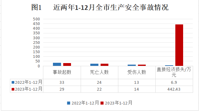 內容摘要 2023年1-12月,全市發生生產安全事故29起、死亡22人、受傷14人、直接經濟損失442.43萬元。 一、1-12月生產安全事故概況 全市發生生產安全事故29起、死亡22人、受傷14人、直接經濟損失442.43萬元,同比分別減少4起、減少2人、增加1人、增加435.53萬元,事故起數、死亡人數、受傷人數、直接經濟損失同比分別下降12.1%、下降8.3%、上升7.7%、上升6312%。 二、各鎮(街)、翠山湖管委會事故情況 三埠街道發生交通運輸、倉儲和郵政業事故2起,建筑業事故1起;長沙街道發生交通運輸、倉儲和郵政業事故2起,商貿制造業事故1起;月山鎮發生交通運輸、倉儲和郵政業事故2起;水口鎮發生交通運輸、倉儲和郵政業事故7起,商貿制造業事故1起;沙塘鎮發生交通運輸、倉儲和郵政業事故1起,商貿制造業事故1起;龍勝鎮發生交通運輸、倉儲和郵政業事故2起;赤坎鎮發生交通運輸、倉儲和郵政業事故2起;百合鎮發生交通運輸、倉儲和郵政業事故2起;金雞鎮發生交通運輸、倉儲和郵政業事故2起;大沙鎮發生農林牧漁業事故1起;翠山湖管委會發生交通運輸、倉儲和郵政業事故2起;其他鎮沒有發生生產安全事故。 三、全市各行業事故情況 (一)各行業事故占比情況 全市共發生生產安全事故29起,其中交通運輸、倉儲和郵政業24起,占82.75%;商貿制造業3起,占10.35%,建筑業1起,占3.45%;農林牧漁業1起,占3.45%,采礦業和其他行業未發生生產安全事故。 (二)各行業事故基本情況 (1)農林牧漁業。發生1起事故,去年同期未發生事故。 (2)采礦業。未發生事故,去年同期未發生事故。 (3)商貿制造業。發生3起事故,去年同期未發生事故。 (4)建筑業。發生1起事故,去年同期未發生事故。 (5)交通運輸、倉儲和郵政業。發生事故24起(其中道路運輸24起)、死亡18人,去年同期發生事故33起、死亡24人,事故起數和死亡人數同比分別下降27.3%、下降25%。 (6)其他行業。未發生事故,去年同期未發生事故。 四、1-12月生產安全事故特點 1.道路交通領域安全總體形勢平穩,但依然嚴峻。1-12月,全市發生道路運輸事故24起、死亡18人、受傷14人,事故起數、死亡人數、受傷人數同比分別下降27.3%、下降25%、上升7.7%,事故起數、死亡人數實現“雙下降”。 2.工礦商貿領域安全形勢嚴峻。1-12月,全市商貿制造業發生3起事故,死亡2人,事故起數、死亡人數同比上升300%、上升200%,安全形勢不容樂觀。 3.建筑業、農林牧漁業等行業領域安全總體形勢可控。1-12月,全市建筑業發生1起事故,死亡1人;農林牧漁業發生1起事故,死亡1人,其他行業未發生生產安全事故。 五、下一步工作措施 1.提高政治站位,樹牢安全發展理念。深入學習習近平總書記關于安全生產的重要指示批示精神,不斷強化紅線意識和底線思維,統籌好發展和安全,始終把“人民至上、生命至上”的理念貫穿到經濟建設發展各項工作中;各行業主管部門要進一步提高政治站位,嚴格按照“三個必須”的要求,按照“黨政同責、一崗雙責、齊抓共管、失職追責”要求,狠抓安全生產責任和工作措施落實,全力確保我市安全生產形勢穩定;全市各類生產經營單位要清醒認識安全生產工作對企業生存發展的重要意義,切實將“安全第一”的理念和自身主體責任落實到生產經營活動中。 2.強化安全監管及宣傳,抓好重點領域的專項治理。各級各部門要結合當前安全風險管控特點,科學部署,標本兼治,在出重拳、用實招、求實效上下功夫,持續加大對重點領域的管控力度。道路交通方面,針對交通繁忙的時間段,突出長途客車、旅游包車、危化品運輸車輛等重點車輛,強化對重點運輸企業的執法檢查,嚴厲打擊“三超一疲勞”等交通違法違規行為,同時要持續加大道路交通安全宣傳,提高全民安全出行意識;消防安全方面,要加強對熱點度假區景區、大型商業綜合體、餐飲娛樂、賓館民宿等人員密集場所的安全隱患排查和消防監督執法,提高消防防范意識;建筑施工方面,要嚴防各類項目趕工期、搶進度以及惡劣天氣條件下冒險施工、違規作業等引發坍塌,火災等事故,嚴防違規裝飾裝修、擅自用作經營引發群死群傷事故。 3.加強特殊危險作業安全管理,落實審批和專人監護。生產經營單位應當依照相關法律法規、規程規章的要求制定完善特殊危險作業安全管理制度,明確特殊危險作業的種類、范圍、職責、審批權限及流程、安全條件確認、監護、應急等相關要求。生產經營單位進行吊裝、動火、臨時用電、高處作業以及國務院應急管理部門會同國務院有關部門規定的其他危險作業時,應嚴格開展危險作業審批。進行危險作業時,須安排專門人員進行現場安全管理,確保操作規程的遵守和安全措施的落實。