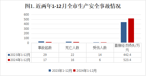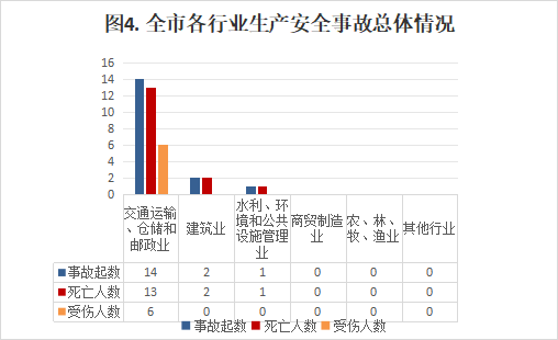 內(nèi)容摘要 2024年1-12月,全市發(fā)生生產(chǎn)安全事故17起、死亡16人、受傷6人、直接經(jīng)濟損失約523.4萬元。 一、1-12月生產(chǎn)安全事故概況 全市發(fā)生生產(chǎn)安全事故17起、死亡16人、受傷6人、直接經(jīng)濟損失523.4萬元,同比分別減少12起、減少6人、減少8人,增加81萬元,事故起數(shù)、死亡人數(shù)、受傷人數(shù)、直接經(jīng)濟損失同比分別下降41.4%、下降27.3%、下降57.1%、上升18.3%。 二、各鎮(zhèn)(街)、翠山湖管委會事故情況 長沙街道發(fā)生交通運輸、倉儲和郵政業(yè)事故3起,水利、環(huán)境和公共設(shè)施管理業(yè)1起;水口鎮(zhèn)發(fā)生交通運輸、倉儲和郵政業(yè)事故2起、建筑施工事故1起;沙塘鎮(zhèn)發(fā)生交通運輸、倉儲和郵政業(yè)事故1起;蒼城鎮(zhèn)發(fā)生建筑施工事故1起;龍勝鎮(zhèn)發(fā)生交通運輸、倉儲和郵政業(yè)事故1起;馬岡鎮(zhèn)發(fā)生交通運輸、倉儲和郵政業(yè)事故2起;塘口鎮(zhèn)發(fā)生交通運輸、倉儲和郵政業(yè)事故1起;赤坎鎮(zhèn)發(fā)生交通運輸、倉儲和郵政業(yè)事故1起;百合鎮(zhèn)發(fā)生交通運輸、倉儲和郵政業(yè)事故1起;蜆岡鎮(zhèn)發(fā)生交通運輸、倉儲和郵政業(yè)事故1起;赤水鎮(zhèn)發(fā)生交通運輸、倉儲和郵政業(yè)事故1起;其他鎮(zhèn)沒有發(fā)生生產(chǎn)安全事故(三埠街道、月山鎮(zhèn)、大沙鎮(zhèn)、金雞鎮(zhèn)、翠山湖管委會)。 三、全市各行業(yè)事故情況 (一)各行業(yè)事故占比情況 全市共發(fā)生生產(chǎn)安全事故17起,其中交通運輸、倉儲和郵政業(yè)14起,占82.3%;建筑施工2起,占11.7%,環(huán)境和公共設(shè)施管理業(yè)1起,占5%,其他行業(yè)未發(fā)生生產(chǎn)安全事故。 (二)各行業(yè)事故基本情況 (1)農(nóng)林牧漁業(yè)。未發(fā)生事故,去年同期未發(fā)生事故。 (2)采礦業(yè)。未發(fā)生事故,去年同期未發(fā)生事故。 (3)商貿(mào)制造業(yè)。未發(fā)生事故,去年同期未發(fā)生事故。(4)建筑業(yè)。發(fā)生2起事故,死亡2人,去年同期 發(fā)生事故1起,事故起數(shù)和死亡人數(shù)同比分別上升100%、上升100%。 (5)交通運輸、倉儲和郵政業(yè)。發(fā)生事故14起(其中道路運輸14起)、死亡13人,去年同期發(fā)生事故24起、死亡18人,事故起數(shù)和死亡人數(shù)同比分別下降41.7%、下降27.8%。 (7)水利、環(huán)境和公共設(shè)施管理業(yè)。發(fā)生1起事故, 死亡1人,去年同期未發(fā)生事故,事故起數(shù)和死亡人數(shù) 同比分別上升100%、上升100%。 (8)其他行業(yè)。未發(fā)生事故。 四、1-12月生產(chǎn)安全事故特點 1.道路交通領(lǐng)域安全總體平穩(wěn),但依然嚴峻。1-12月,全市發(fā)生道路運輸事故14起、死亡13人、受傷8人,事故起數(shù)、死亡人數(shù)、受傷人數(shù)同比分別下降41.1%、下降27.8%、下降57.1%,事故起數(shù)、死亡人數(shù)實現(xiàn)“雙下降”,但是占比全市生產(chǎn)安全事故的82.3%,形勢依然嚴峻。 2.建筑施工行業(yè)安全形勢要引起重視。1-12月,全市建筑施工行業(yè)發(fā)生2起生產(chǎn)安全事故,死亡2人,事故起數(shù)、死亡人數(shù)同比上升100%、上升100%,特別是近年來,涉及光伏安裝項目工程增多,高處作業(yè)隨之增多,安全風險也隨之增加,要引起重視,采取有效措施,開展全方位、動態(tài)化的風險辨識和隱患排查治理,防范行業(yè)領(lǐng)域生產(chǎn)安全事故。 3.農(nóng)林牧漁業(yè)等行業(yè)領(lǐng)域安全總體形勢平穩(wěn)。農(nóng)林牧漁業(yè)和其他行業(yè)未發(fā)生生產(chǎn)安全事故,安全生產(chǎn)形勢平穩(wěn)。 五、下一步工作措施 1.堅持安全發(fā)展,堅持“安全第一、預防為主、綜合治理”的方針。按照“黨政同責、一崗雙責、齊抓共管、失職追責”和“管行業(yè)必須管安全、管業(yè)務必須管安全、管生產(chǎn)經(jīng)營必須管安全”的總要求,繼續(xù)加強對安全生產(chǎn)工作的領(lǐng)導,明確職責,落實責任,建立健全各項規(guī)章制度,進一步強化安全生產(chǎn)防范措施。 2.持續(xù)深入推進“打非治違”專項行動。根據(jù)市委、市政府的安排部署,嚴格掌握標準,通過突擊檢查、重點抽查、跟蹤檢查、聯(lián)合檢查等多種方式,有針對的嚴厲打擊非法違法生產(chǎn)經(jīng)營建設(shè)行為。同時重點加強對道路運輸、危險化學品、建筑施工、城鎮(zhèn)燃氣等領(lǐng)域的安全監(jiān)管,繼續(xù)實行日常監(jiān)管與重點檢查相結(jié)合、重要時段檢查與專項督查相結(jié)合的安全監(jiān)管辦法,查找和整改治理一批安全隱患,解決突出問題,加大對生產(chǎn)過程中各類違規(guī)、違法行為的打擊力度,促進全市安全生產(chǎn)形勢持續(xù)穩(wěn)定向好。 3.加強安全教育宣傳,增強全民安全意識。大張旗鼓地宣傳《中華人民共和國安全生產(chǎn)法》等法律法規(guī),堅持“安全第一、預防為主、綜合治理”方針,一方面要以多種形式加大安全生產(chǎn)宣傳力度,營造強大的輿論氛圍,增強全民安全意識;另一方面要督促企業(yè)落實安全生產(chǎn)主體責任,抓好安全生產(chǎn)教育培訓,嚴格落實安全操作規(guī)程,堅決杜絕不按操作規(guī)程開展工作的行為,將“安全無小事”的安全理念貫穿安全生產(chǎn)工作全過程,以更高的站位、更寬的視角不斷優(yōu
