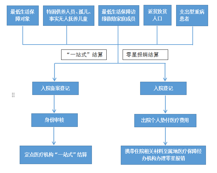 序號①—⑦救助對象在定點醫療機構就醫時,出具相應困難人員身份證件,醫療救助和基本醫療保險、大病保險通過國家醫療保障信息平臺“一站式”同步直接結算,不屬于醫療救助基金支付范圍的,由救助對象個人支付。未能直接結算的,應當如實提供以下材料到戶籍所屬鎮(街)公共服務中心醫療救助經辦點辦理零星報銷手續: