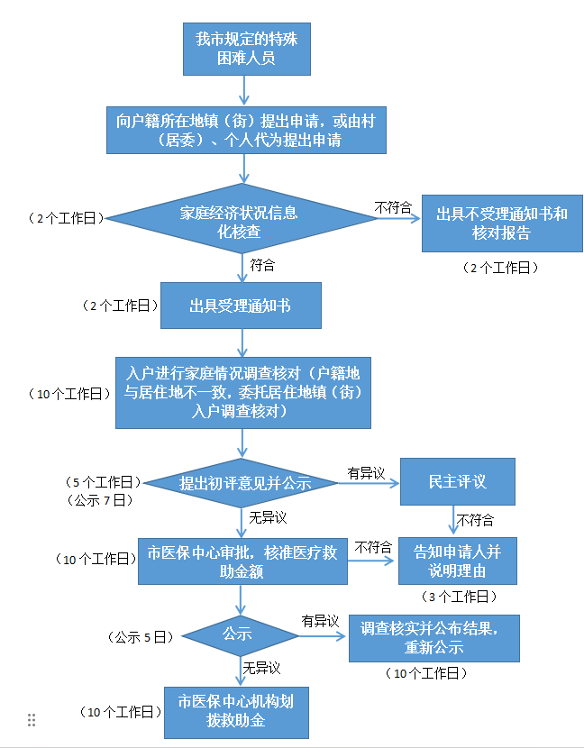 以上我市規定的特殊困難人員,負擔的合規醫療費用,先由個人支付后攜帶相關資料向救助對象戶籍所在地鎮人民政府(街道辦事處)的民政部門提出支出型醫療救助對象身份認定申請,由民政部門進行經濟核查并出具報告。