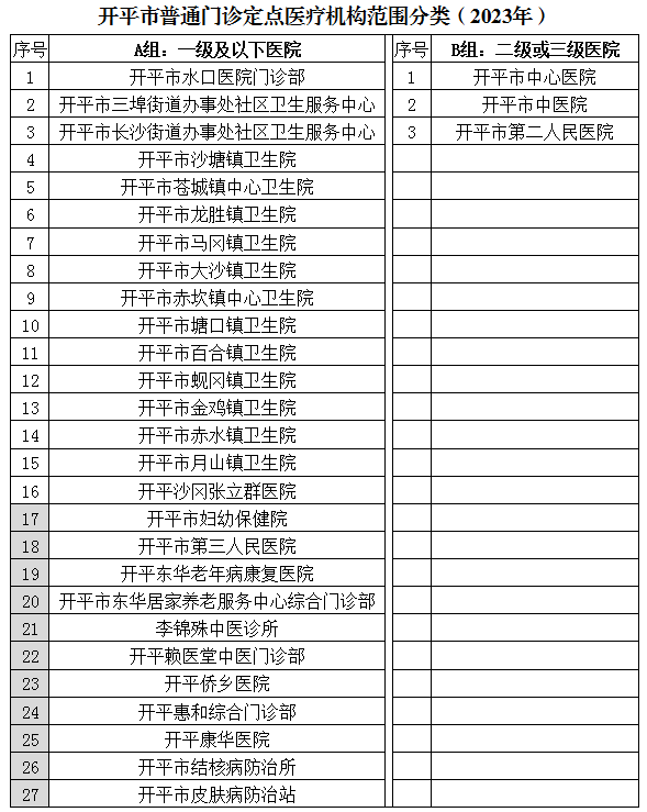 一、普通門診統(tǒng)籌定點(diǎn)醫(yī)療機(jī)構(gòu)范圍按新規(guī)定分為兩類,分別為“一級(jí)及以下定點(diǎn)醫(yī)療機(jī)構(gòu)”和“二級(jí)或三級(jí)定點(diǎn)醫(yī)療機(jī)構(gòu)”,與2022年存在差異(開平市醫(yī)療機(jī)構(gòu)分類見第4頁(yè))。