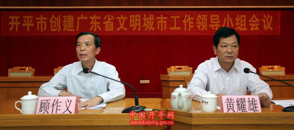 省委宣傳部副部長、省文明辦主任顧作義(左)指導(dǎo)我市創(chuàng)文工作;市委書記黃耀雄(右)主持會議