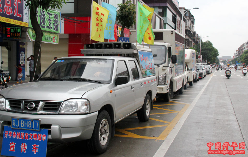 創廣東省文明城市,做文明有禮開平人。7月24日下午,市創文辦、市交警大隊聯合我市10多家商家在城區內開展主題為“文明城市 你我參與”的車隊巡游宣傳活動,進一步加大我市創文宣傳力度。