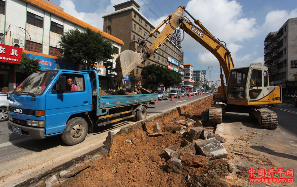 近日,記者途經(jīng)東興大道與曙光路十字路口處見到,該路段花圃所種的植物全被清除,施工工人正在對道路進行改造。