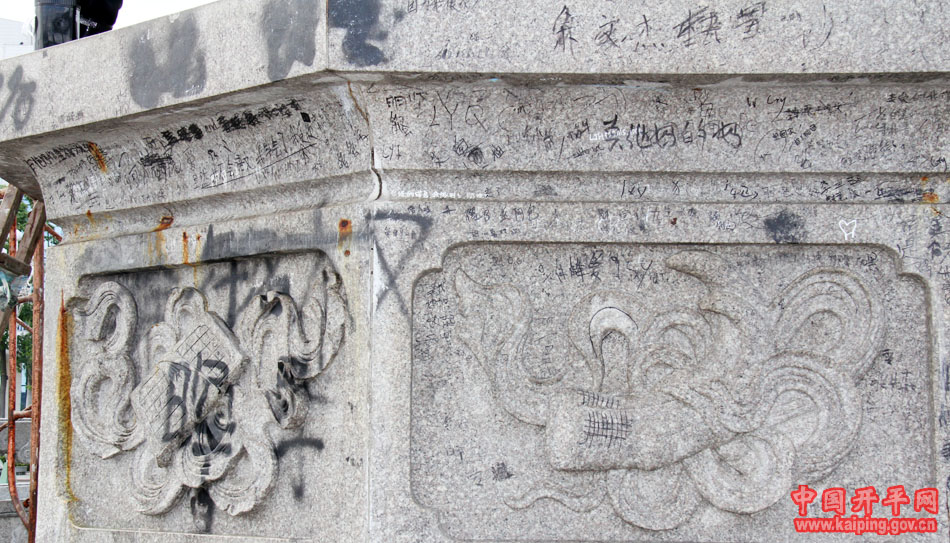 清洗人員通過用清洗槍對兩條龍鳳柱進行沖洗后,再使用多種化學藥品配制而成的藥水對柱子上的亂涂亂畫字跡進行噴灑清洗;然后,用專用洗刷用具對其進行洗刷去污;最后,再用清洗槍進行徹底清理。清洗后的兩條龍鳳柱煥然一新,顯示出更加清晰、干凈的效果。