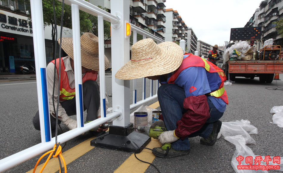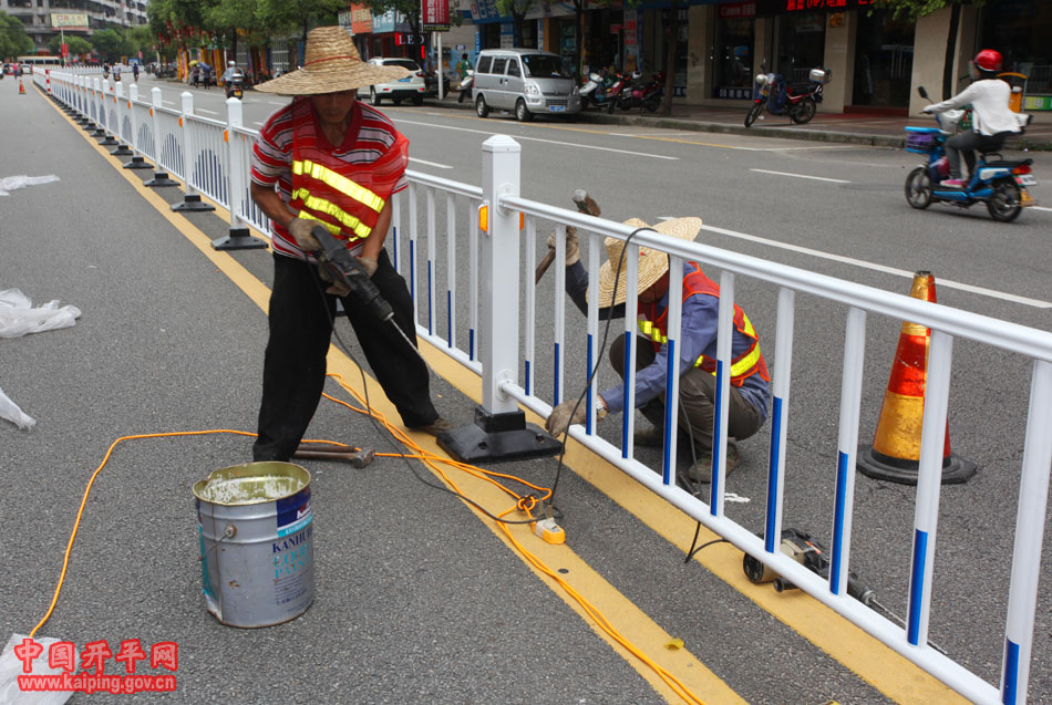 工人正在曙光路安裝護欄