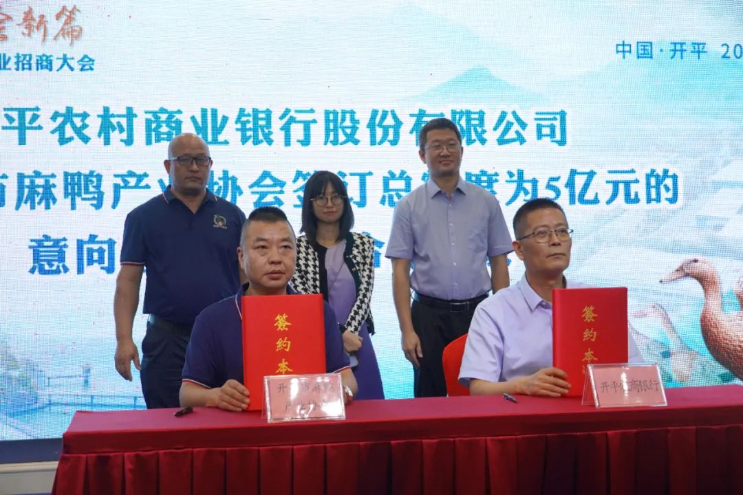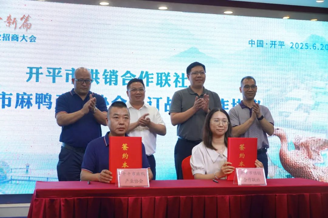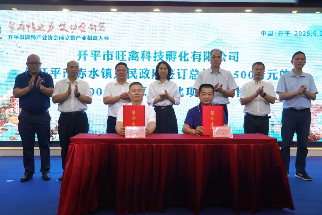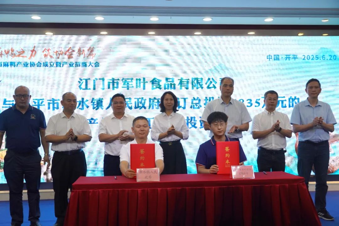 為加速推進開平麻鴨產業向標準化、品牌化、規模化發展,大會聚焦市場化精準招商,促成多項重要合作落地。會上,開平市赤水鎮人民政府分別與開平市旺禽科技孵化有限公司簽訂家禽孵化項目投資協議,與廣東省坤靈農業科技有限公司簽訂禽蛋加工項目投資協議,與江門市軍葉食品有限公司簽訂農產品深加工項目投資協議,三個項目總投資超1億元。開平市麻鴨產業協會分別與開平市供銷合作聯社簽訂戰略合作協議,與開平農村商業銀行股份有限公司簽訂總額度為5億元的意向性授信戰略合作協議。此外,為學習先進經驗,大會還邀請有數百年麻鴨養殖技藝與產業文化的“中國麻鴨之鄉”浙江省縉云縣人大常委會黨組書記、主任趙建銘到場作經驗交流。