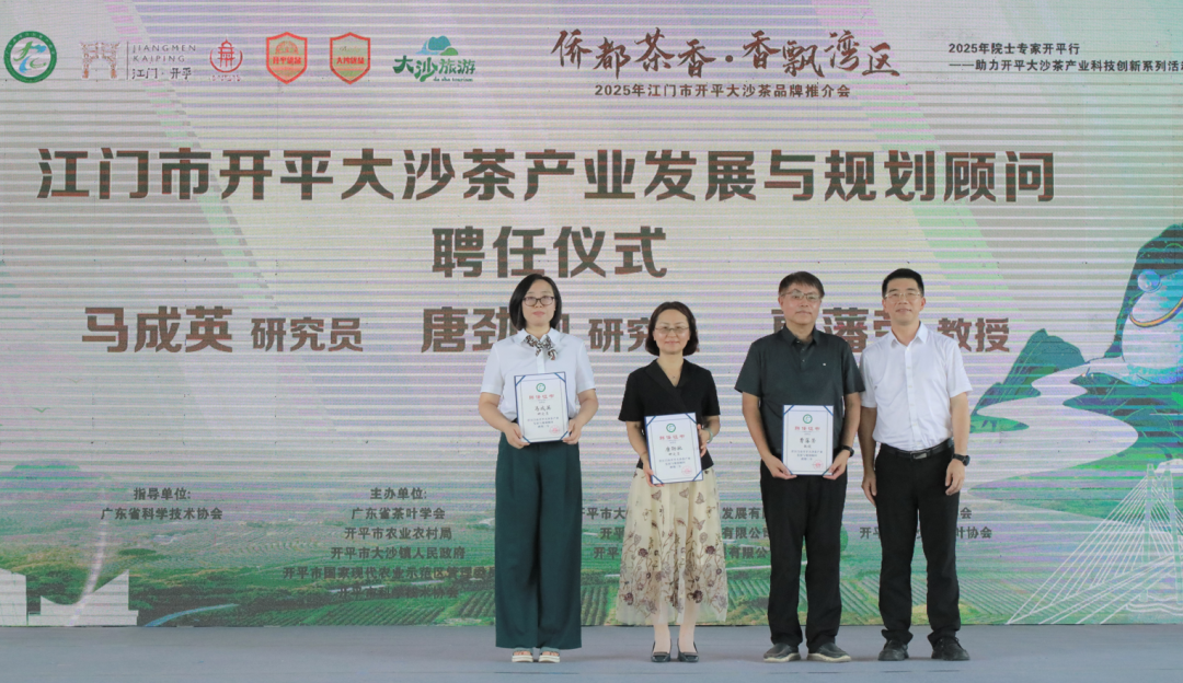活動現場,開平市人民政府正式聘請烏克蘭工程院、俄羅斯自然科學院外籍院士肖更生;廣州中醫藥大學教授、聯合國-國際生態生命安全科學院院士劉煥蘭,廣東省農業科學院茶葉研究所所長、廣東省茶葉學會理事長唐勁馳,華南農業大學園藝學院教授、廣東省茶葉學會副理事長兼秘書長曹藩榮,廣東省農業科學院茶葉研究所研究員馬成英為江門市開平大沙茶產業發展與規劃顧問。