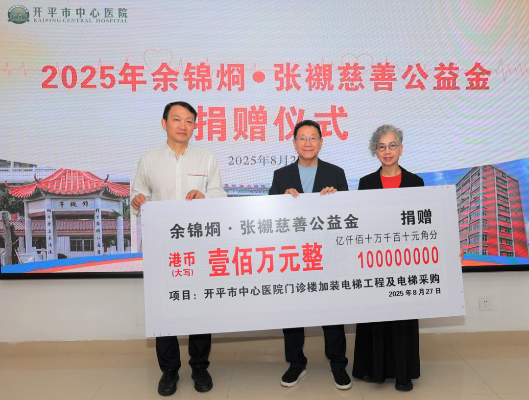 余卓兒先生是旅港著名實業家、慈善家、開平市榮譽市民,多年來不遺余力支持家鄉醫療、教育等慈善公益事業,他從2008年開始捐資扶助開平市中心醫院,并于2015年設立“余錦烱·張襯慈善公益金”,每年捐資支持家鄉慈善公益事業。截至2024年,余卓兒、林翠薇伉儷累計向開平市中心醫院捐贈超4000萬元人民幣,促進開平醫療衛生事業高質量發展。