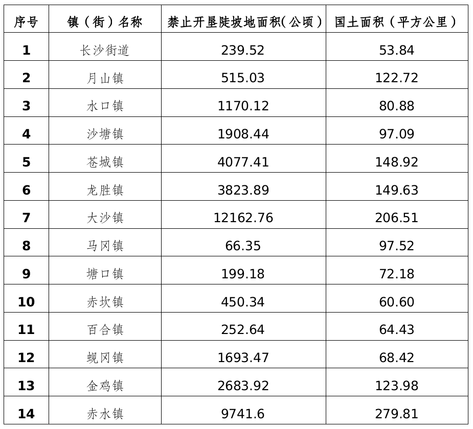 一、依據水利部《禁止開墾陡坡地范圍劃定技術指南》,劃定全禁止開墾陡坡地面積38984.67公頃,涉及長沙街道、月山鎮、水口鎮、沙塘鎮、蒼城鎮、龍勝鎮、大沙鎮、馬岡鎮、塘口鎮、赤坎鎮、百合鎮、蜆岡鎮、金雞鎮、赤水鎮共14個鎮(街)。具體分布范圍和面積見附件。