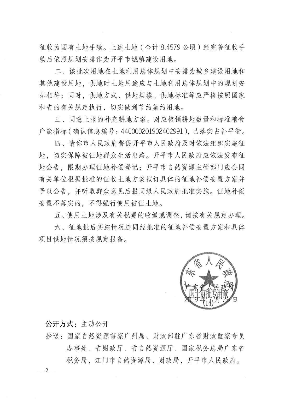 粵府土審(14)[2019]50號 廣東省人民政府關于開平市2019年度第一批次城鎮建設用地地批復