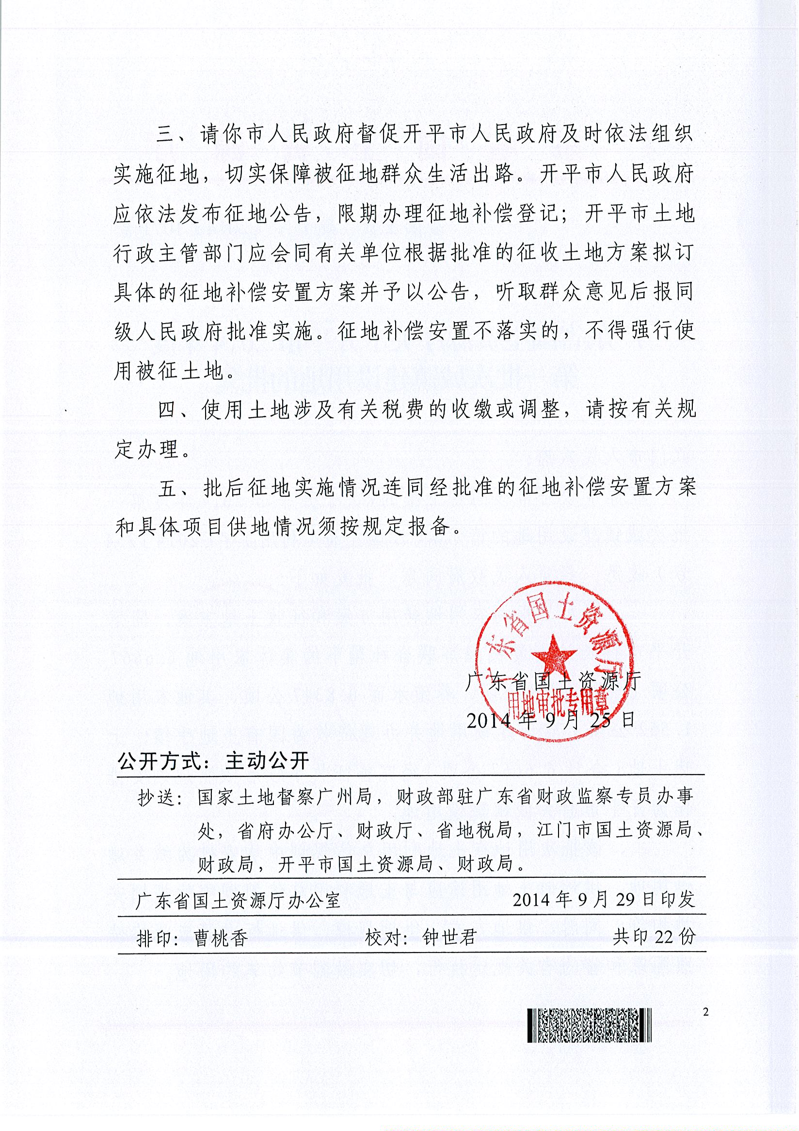 開平市2014年度第一批次城鎮(zhèn)建設用地的批復