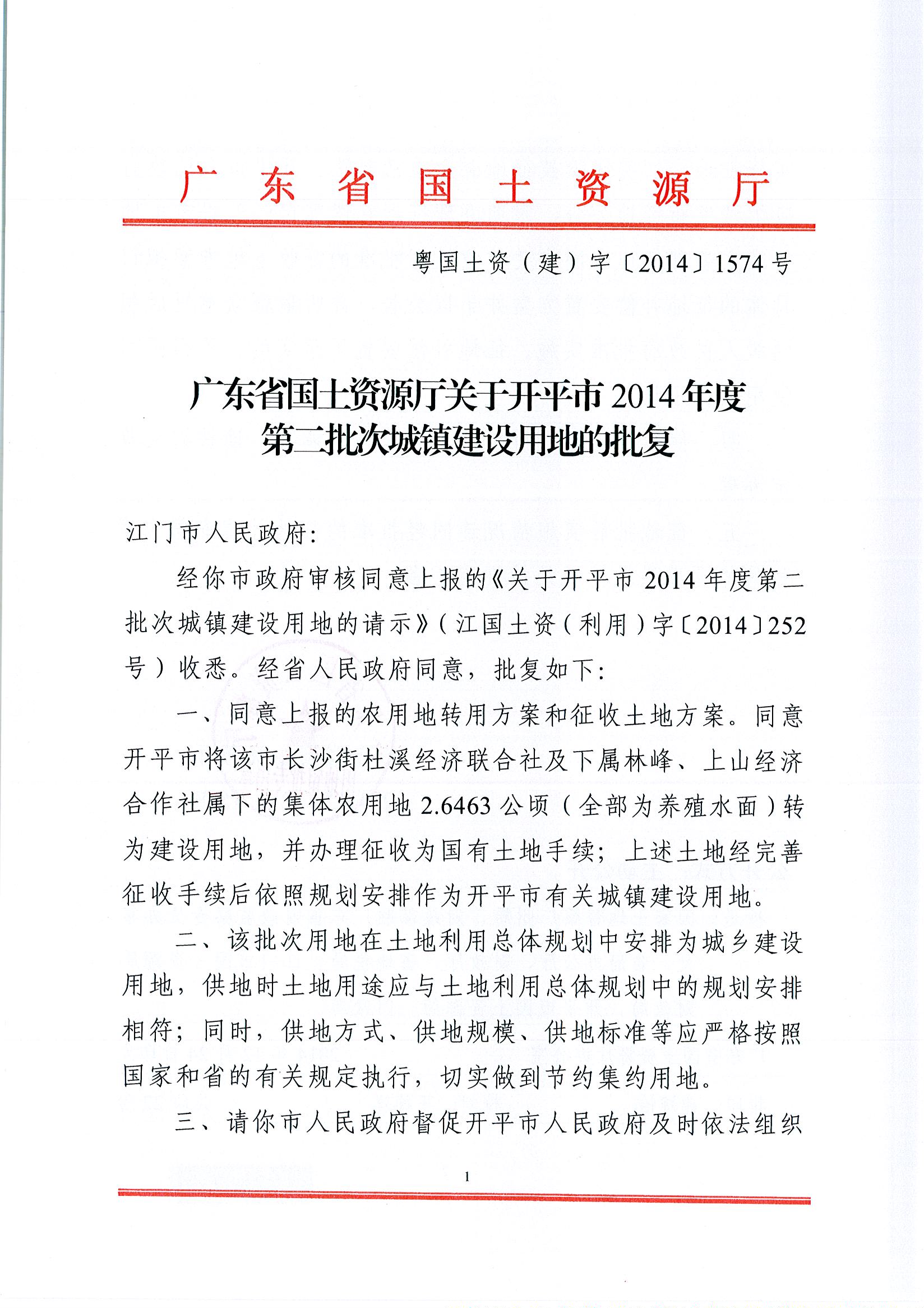 開平市2014年度第二批次城鎮(zhèn)建設(shè)用地的批復(fù)