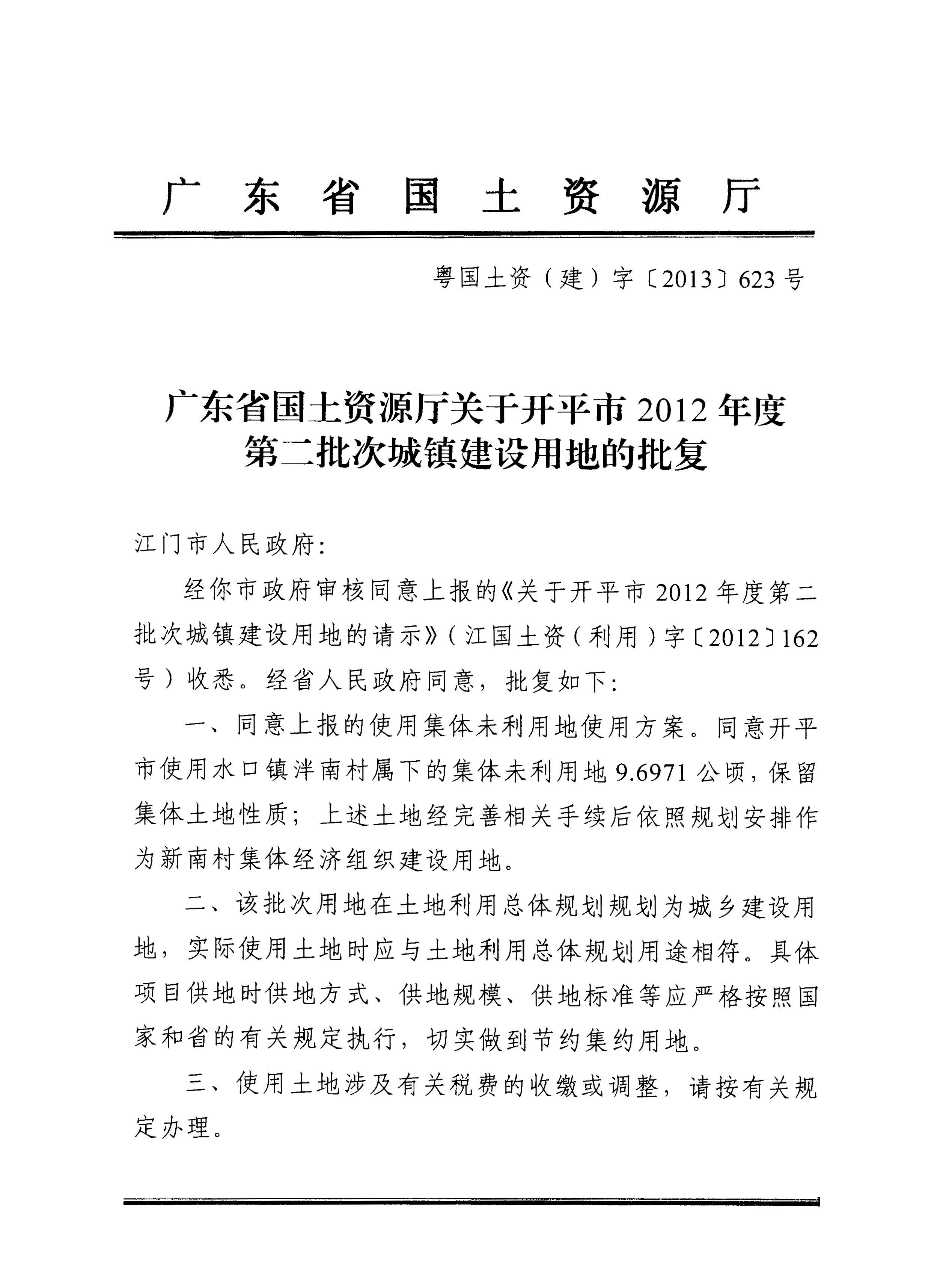 開平市2012年度第二批次城鎮(zhèn)建設(shè)用地的批復(fù)