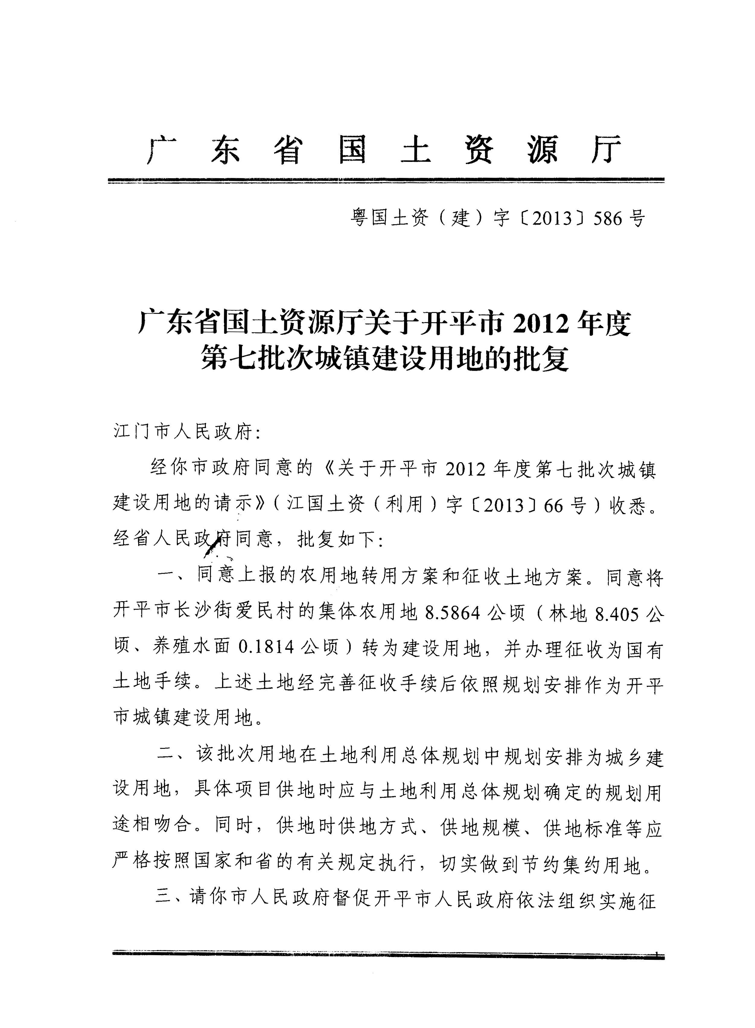 開平市2012年度第七批次城鎮(zhèn)建設(shè)用地的批復(fù)