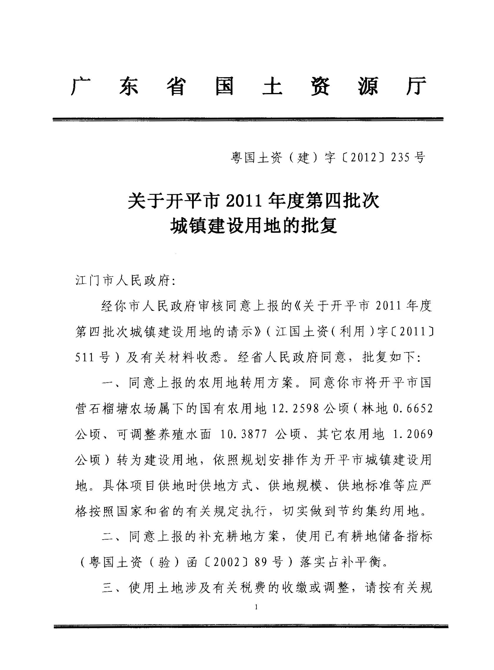 開平市2011年度第四批次城鎮(zhèn)建設(shè)用地的批復(fù)