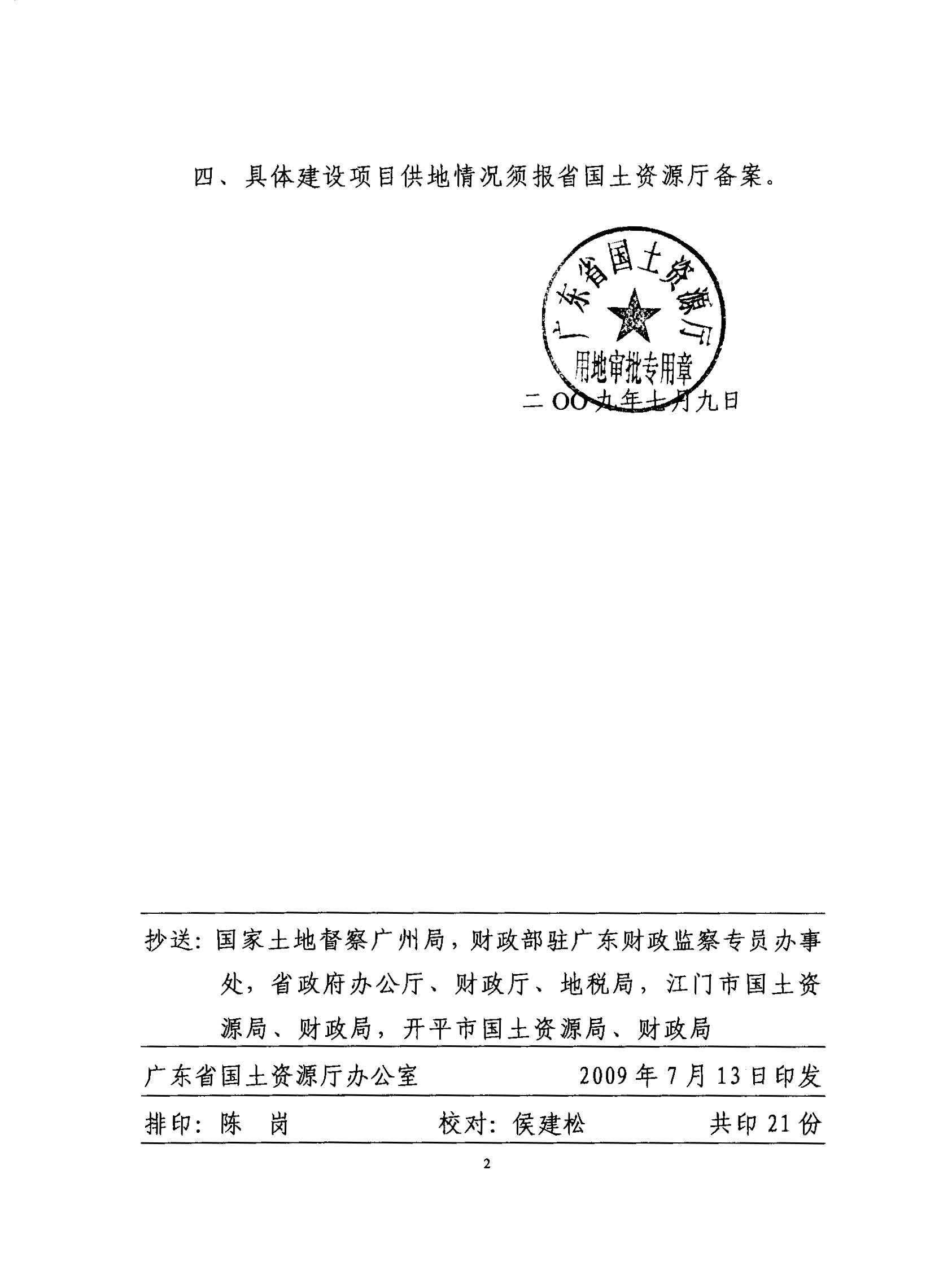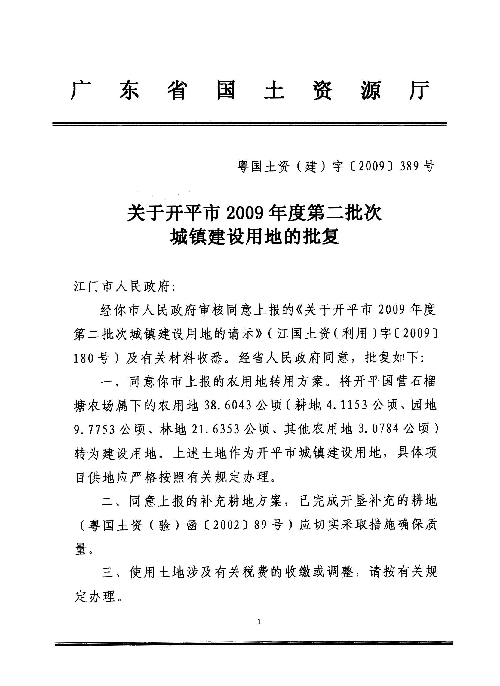 開平市2009年度第二批次城鎮(zhèn)建設用地的批復