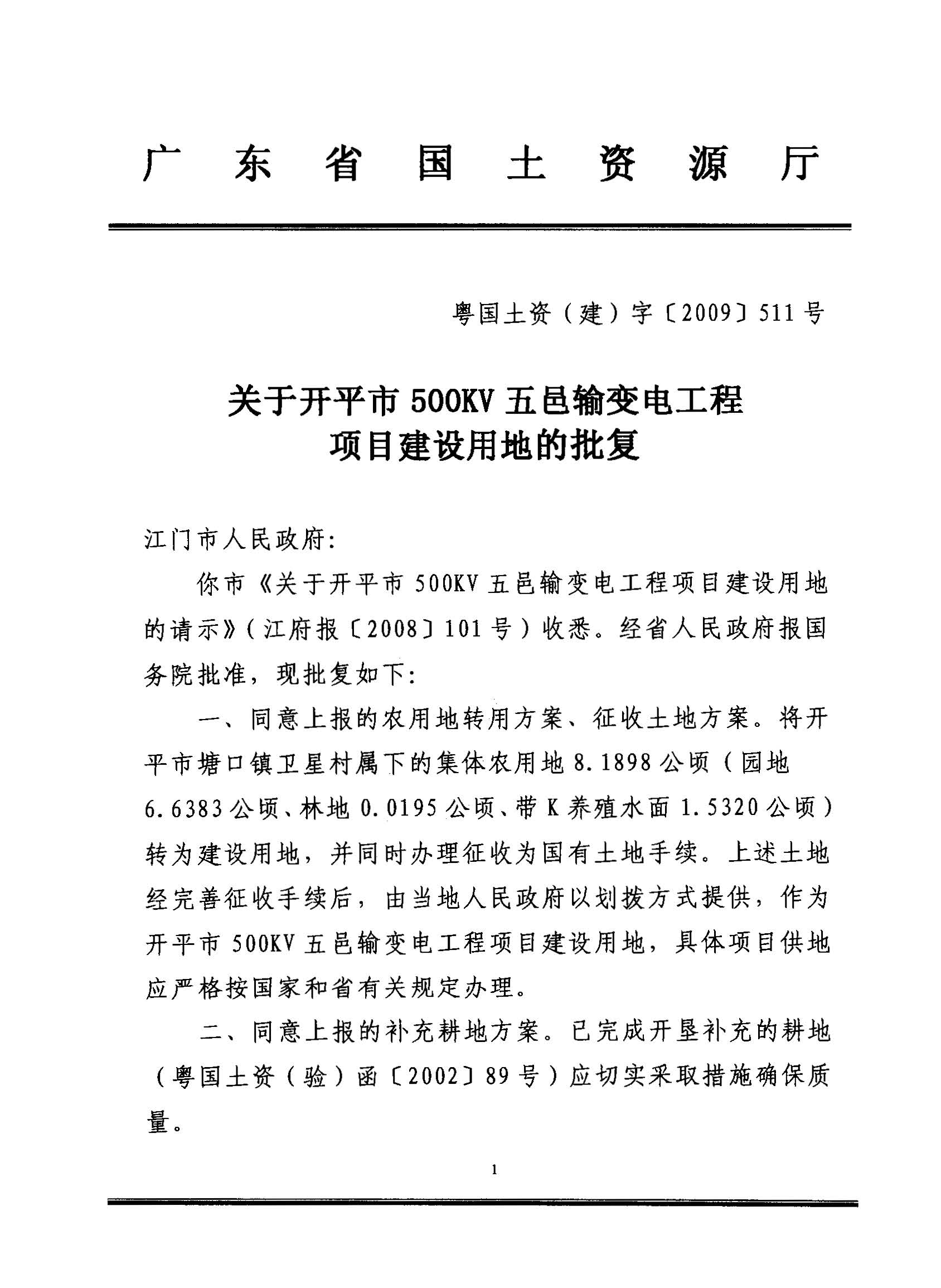 開平市500KV五邑輸變電工程項目建設用地的批復