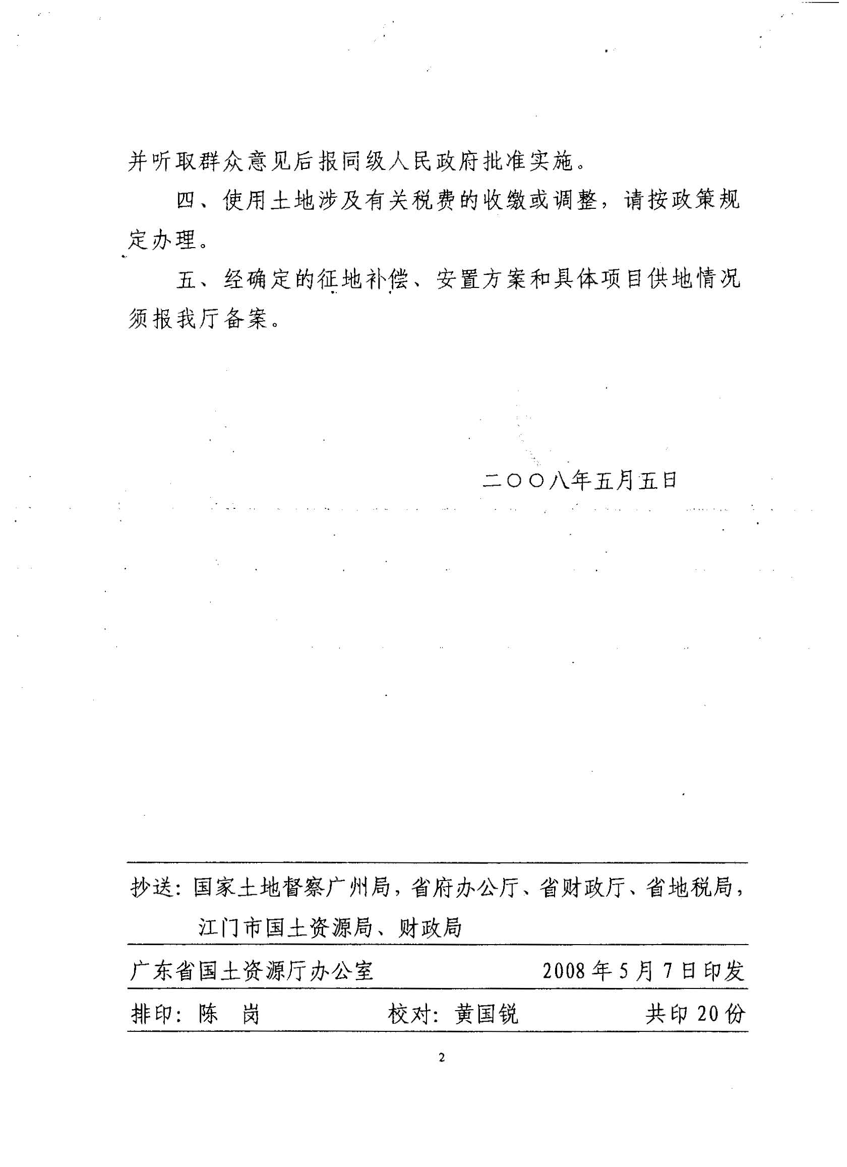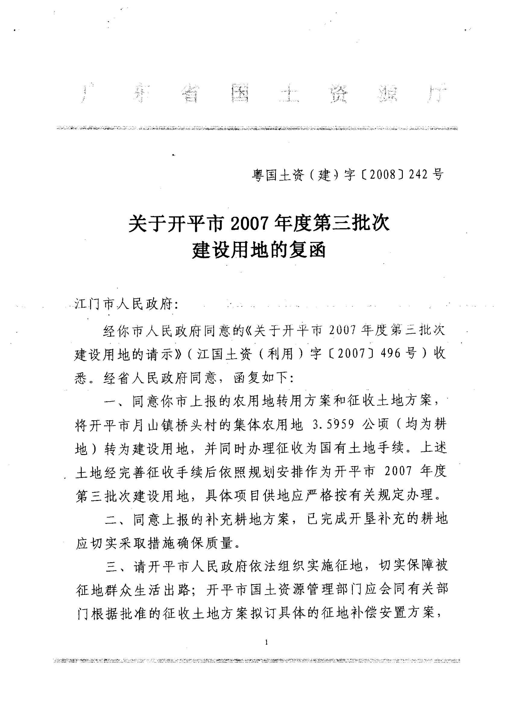 開(kāi)平市2007年度第三批次建設(shè)用地的復(fù)函
