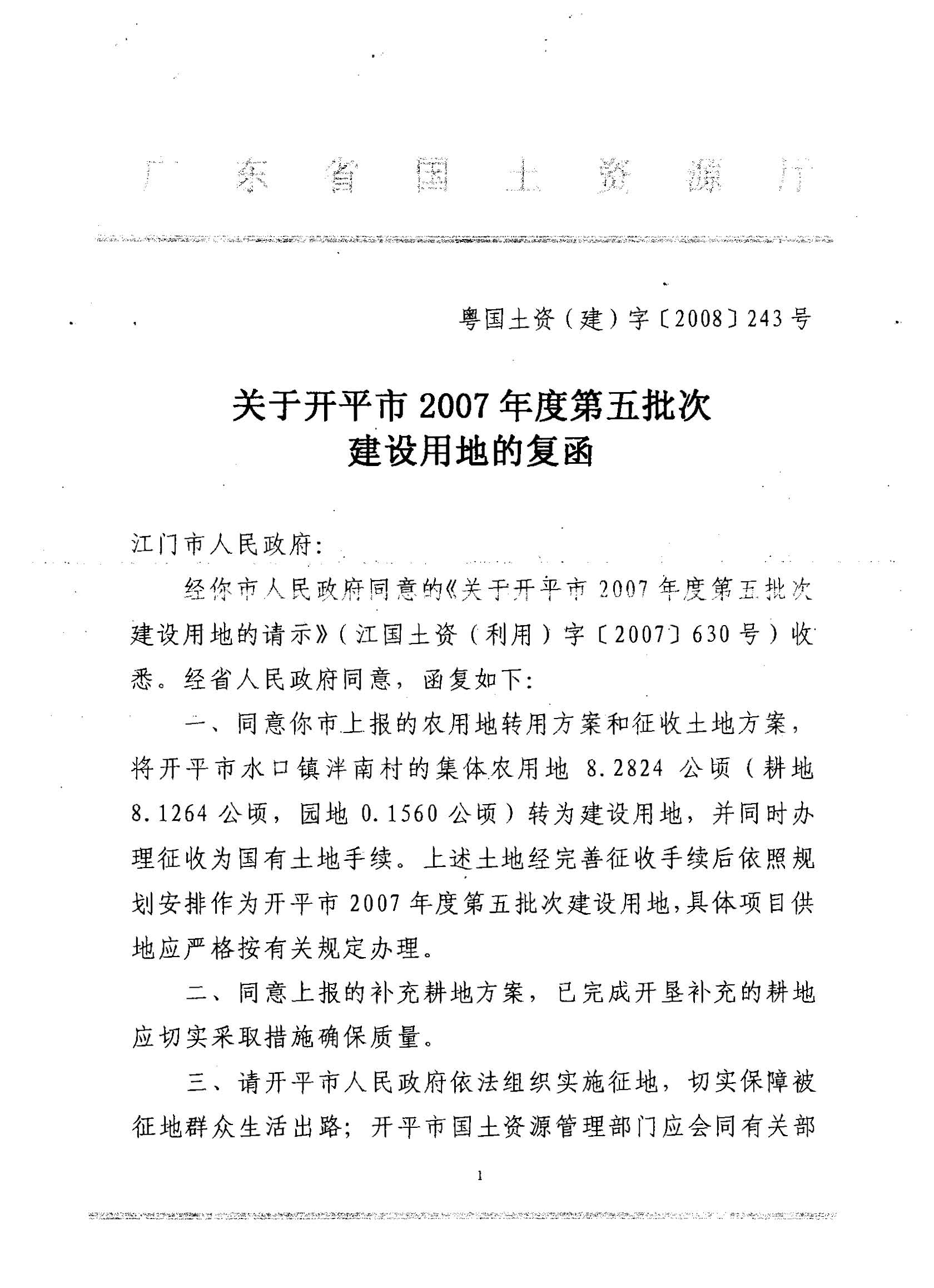 開平市2007年度第五批次建設用地的復函