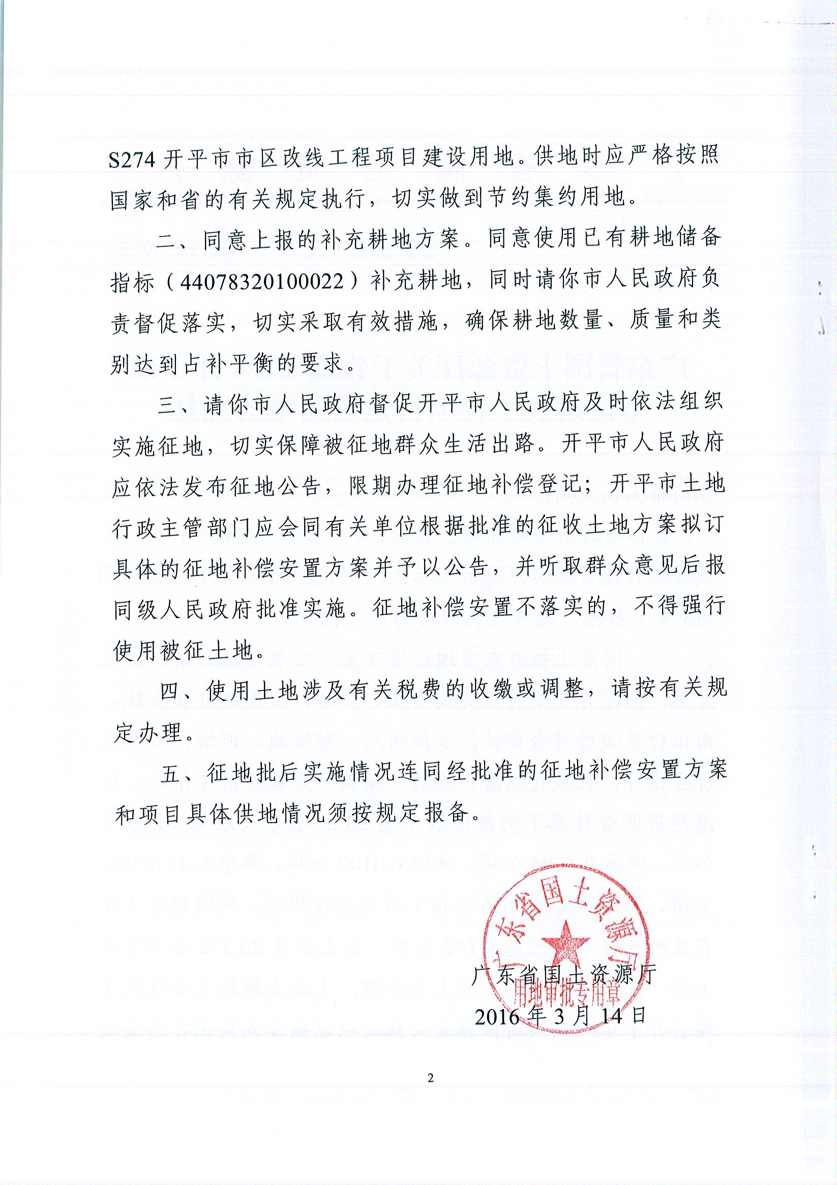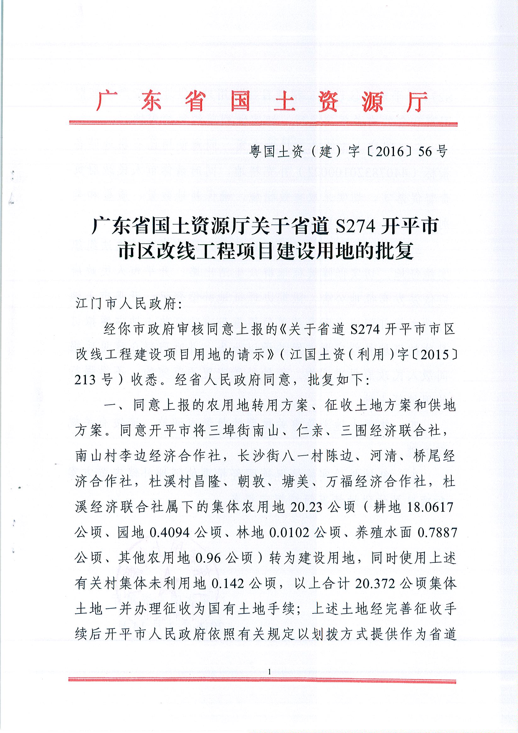 廣東省國(guó)土資源廳關(guān)于省道S274開(kāi)平市市區(qū)改線工程項(xiàng)目建設(shè)用地的批復(fù)