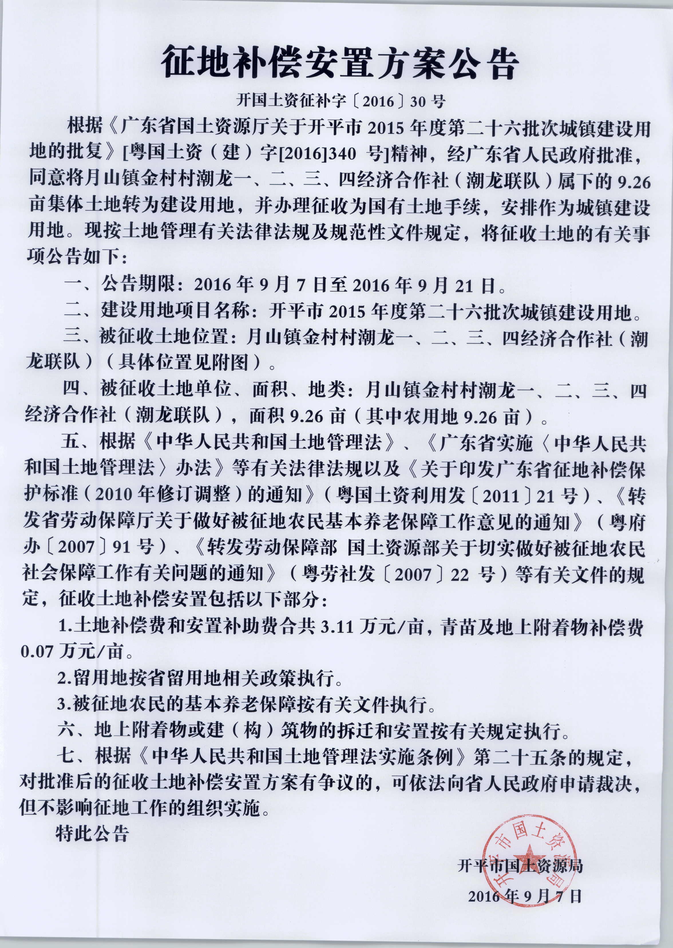 征地補償安置方案公告(開平市2015年度第二十六批次城鎮建設用地)