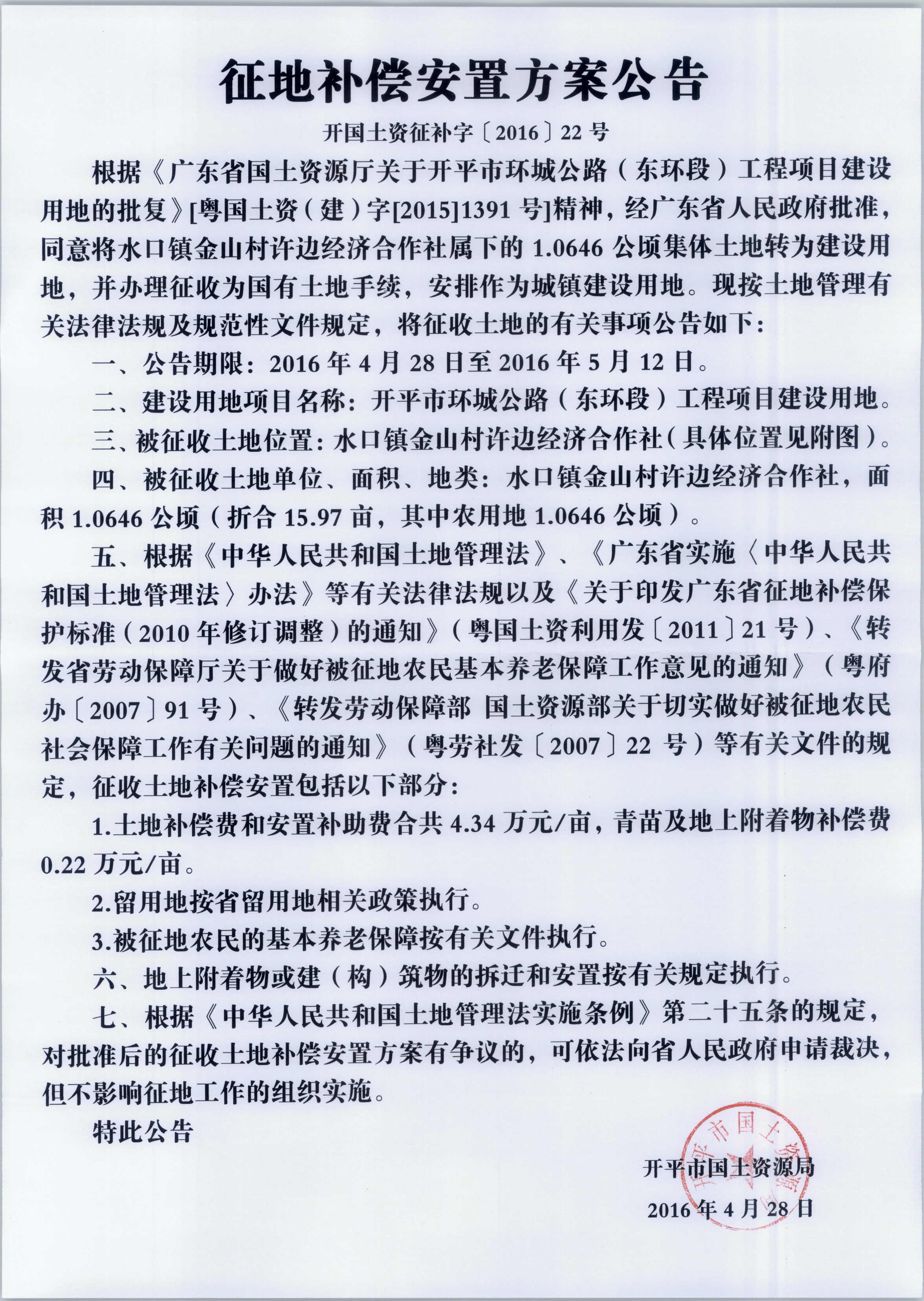 征地補償安置方案公告(開平市環城公路(東環段)工程項目建設用地)