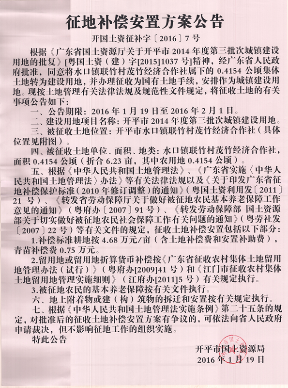 征地補償安置方案公告(開平市2014年度第三批次城鎮建設用地)