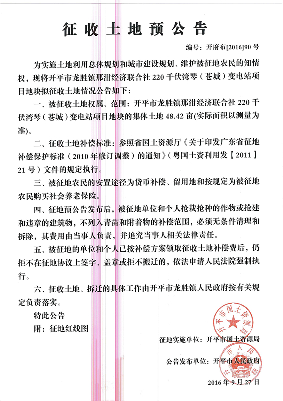 龍勝鎮那泔經濟聯合社220千伏灣琴(蒼城)變電站項目預公告