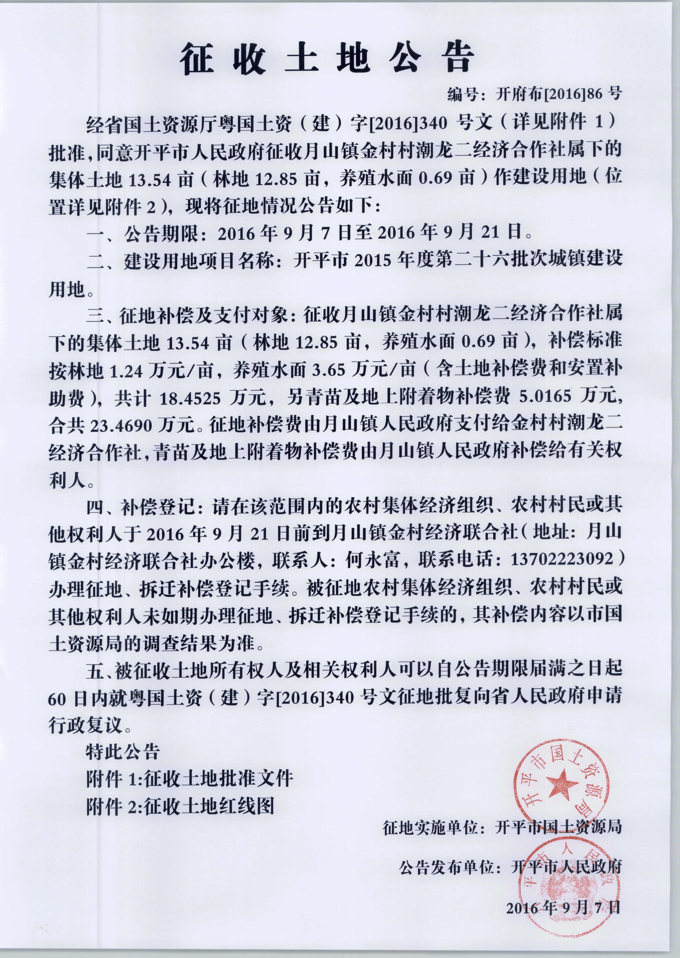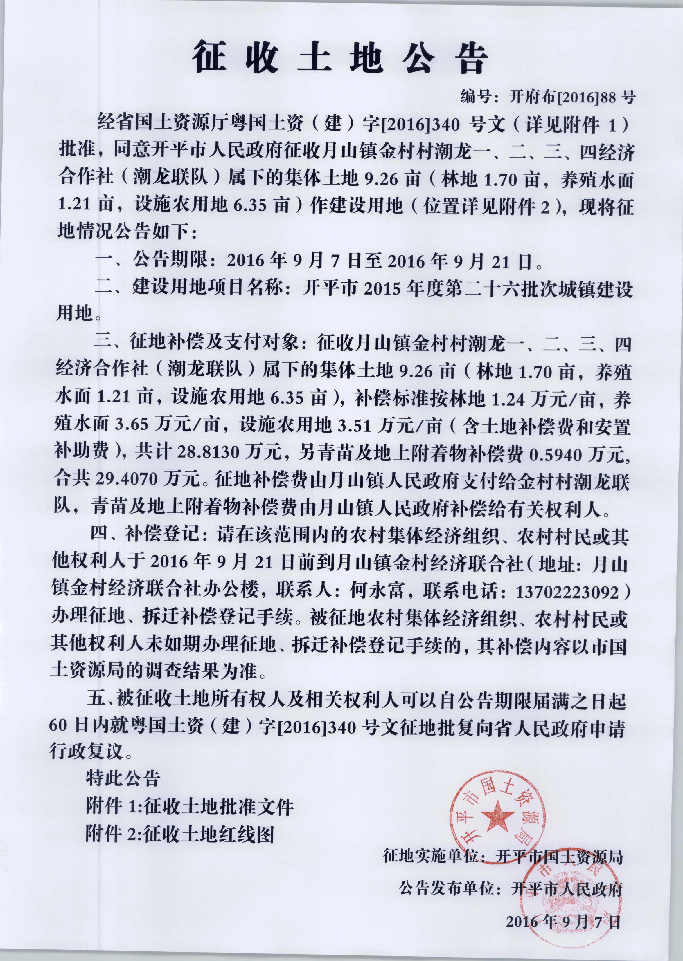 征收土地公告(開(kāi)平市2015年度第二十六批次城鎮(zhèn)建設(shè)用地)