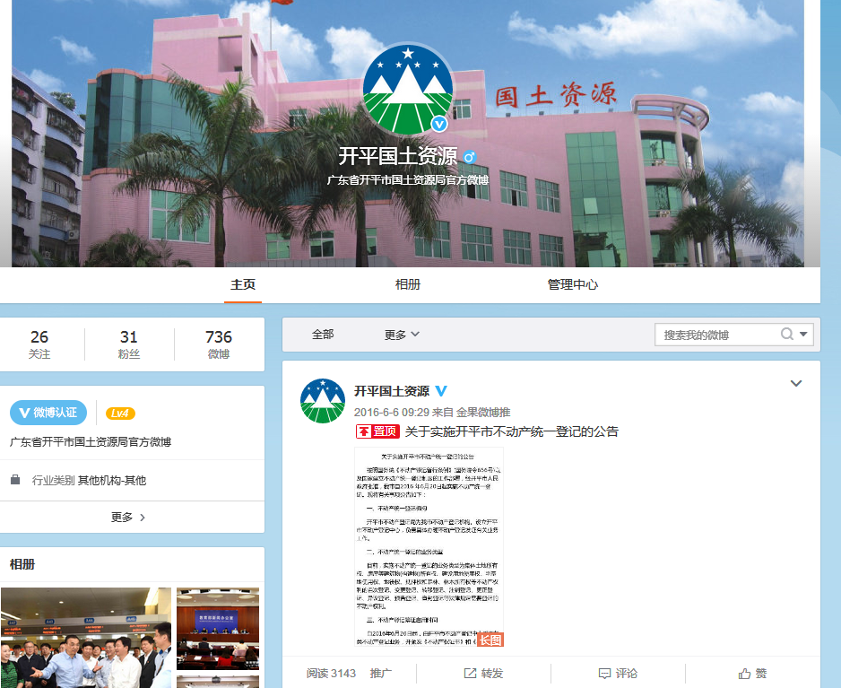 (四)豐富公開形式和內容。2016年,我局繼續通過官方微博和微信公眾號向社會發布最新的國土資源動態、相關國家政策法規特別是黨中央國務院最新的新聞信息。同時繼續做好開平市政府信息公開目錄系統、開平市國土資源局網站的更新工作,及時給企業、群眾提供豐富的國土資源信息。