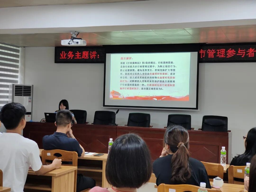 情景模擬后,為進一步“驗收”學員們的學習成果,活動還設置了“執法知識大練兵”環節,內容主要依據《中華人民共和國行政處罰法》《中華人民共和國行政強制法》等法律法規設置單選、判斷等問答題開展競答。學員們通過前面的深入學習后熱情高漲,信心十足,在互動環節紛紛踴躍舉手發言、積極參與,最終,活動在一片掌聲中落下帷幕。