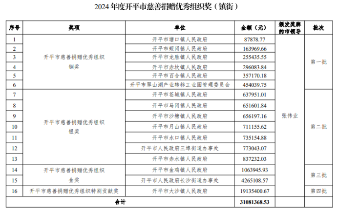 6月:三埠街道榮獲“2024年度開平市慈善捐贈(zèng)優(yōu)秀組織銀獎(jiǎng)”,累計(jì)捐贈(zèng) 773043.07 元,用愛心善舉書寫社會(huì)責(zé)任,讓溫暖浸潤轄區(qū)每一個(gè)角落。